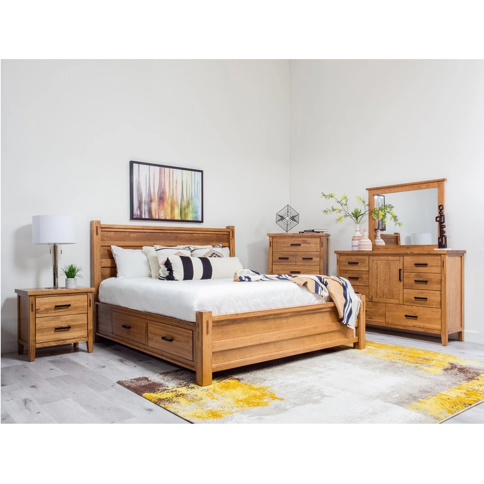 The Hudson Bedroom Set with built in storage in the bed, is a Canadian made product crafted from solid Pine. This elegant bedroom set includes a comfortable bed, a spacious dresser, coordinating mirror and a nightstand, providing a complete solution for your bedroom needs. With custom finishes option available in-store, you can personalize this set to match your unique style and preferences. Experience the perfect blend of quality craftsmanship and customizable design with the Hudson Bedroom Set.