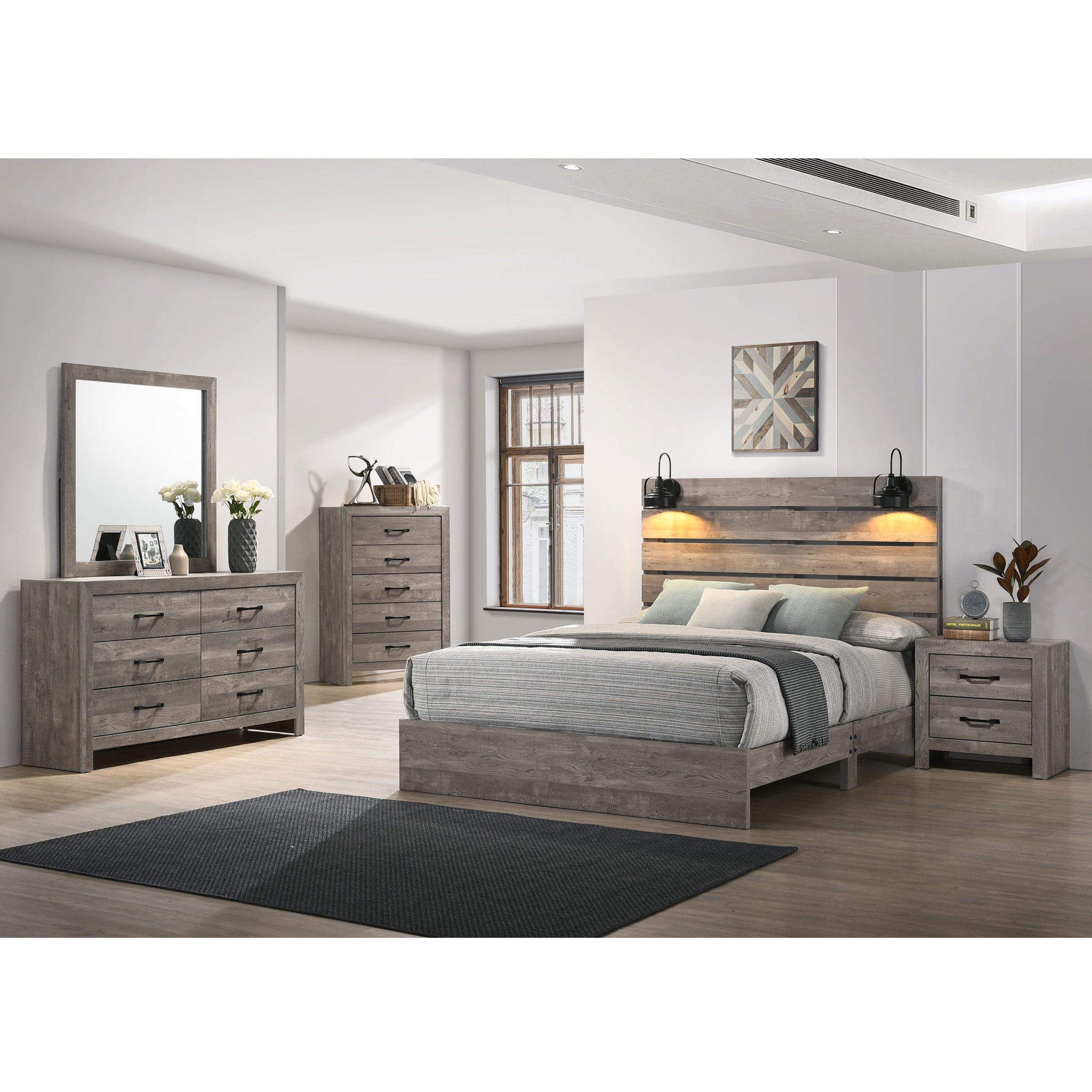 Transform your bedroom with the modern farmhouse charm of the Morris 4pc Bedroom Set in Driftwood Grey. Featuring a high headboard with a shiplap design, this set offers both style and functionality. The headboard includes touch-dimmable lights and USB charging ports, making it easy to set the mood or charge your devices. The platform bed eliminates the need for a box spring, while bottom dust proofing helps keep your space tidy.