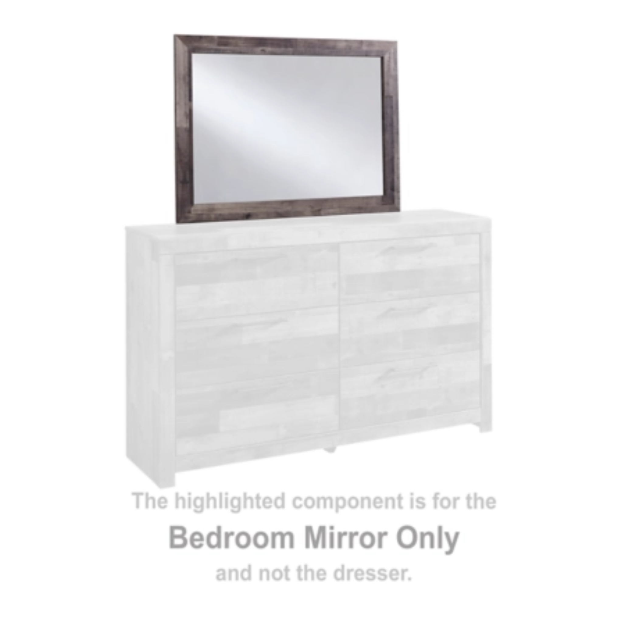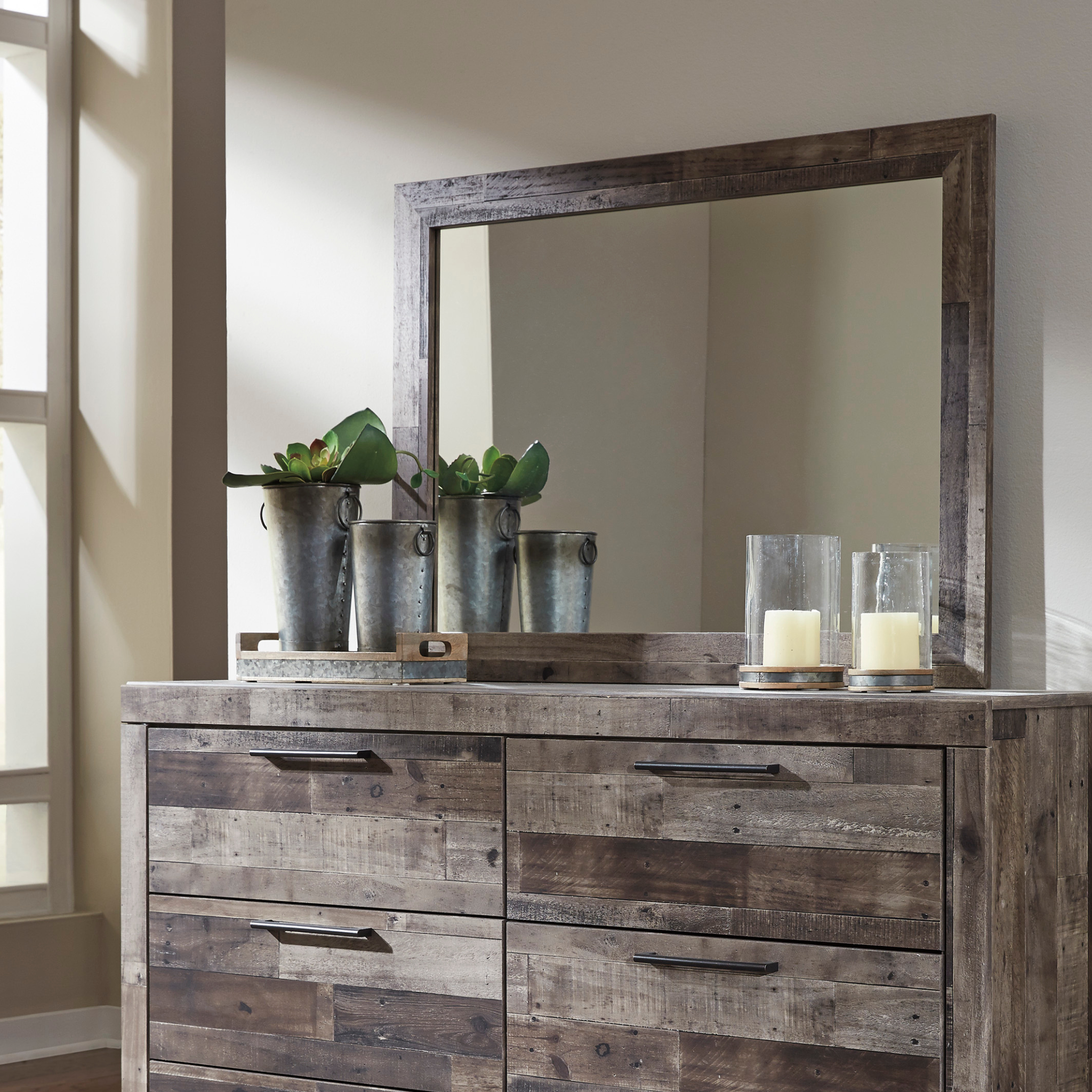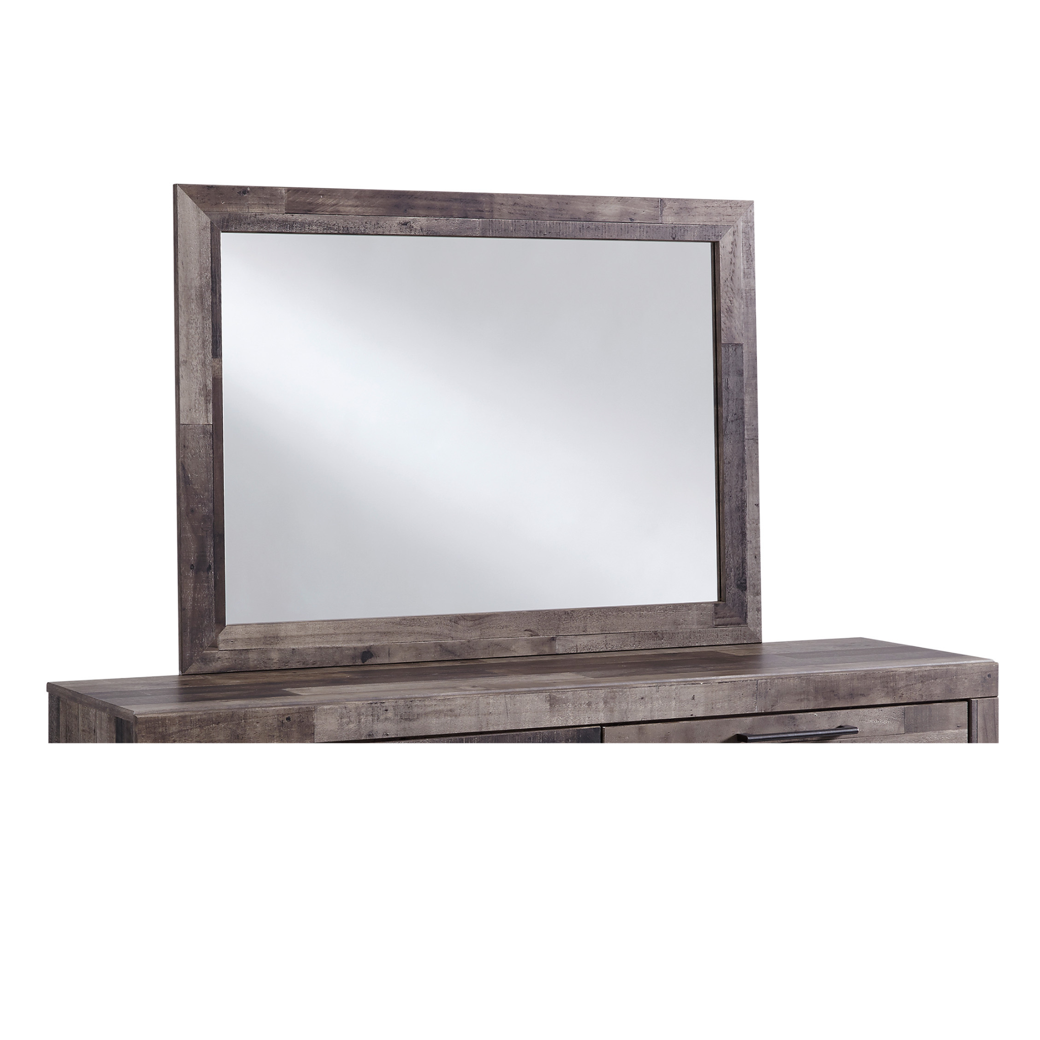 Modern yet hefty. This mirror makes an urban eclectic statement. Seasoned raw wood look merges with the clean lined design we love today. Muted rustic finish over replicated pine grain maintains its authenticity. Beauteous look makes this eye-catching mirror the perfect addition.