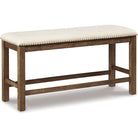 This counter height upholstered bench might be simple at first sight, but a closer look reveals beauty in the details. With a distressed nutmeg finish, antiqued nailhead trim and textured polyester upholstery, it's beaming with charm. Cushioned seat ensures long, lingering meals are enjoyed in total comfort.