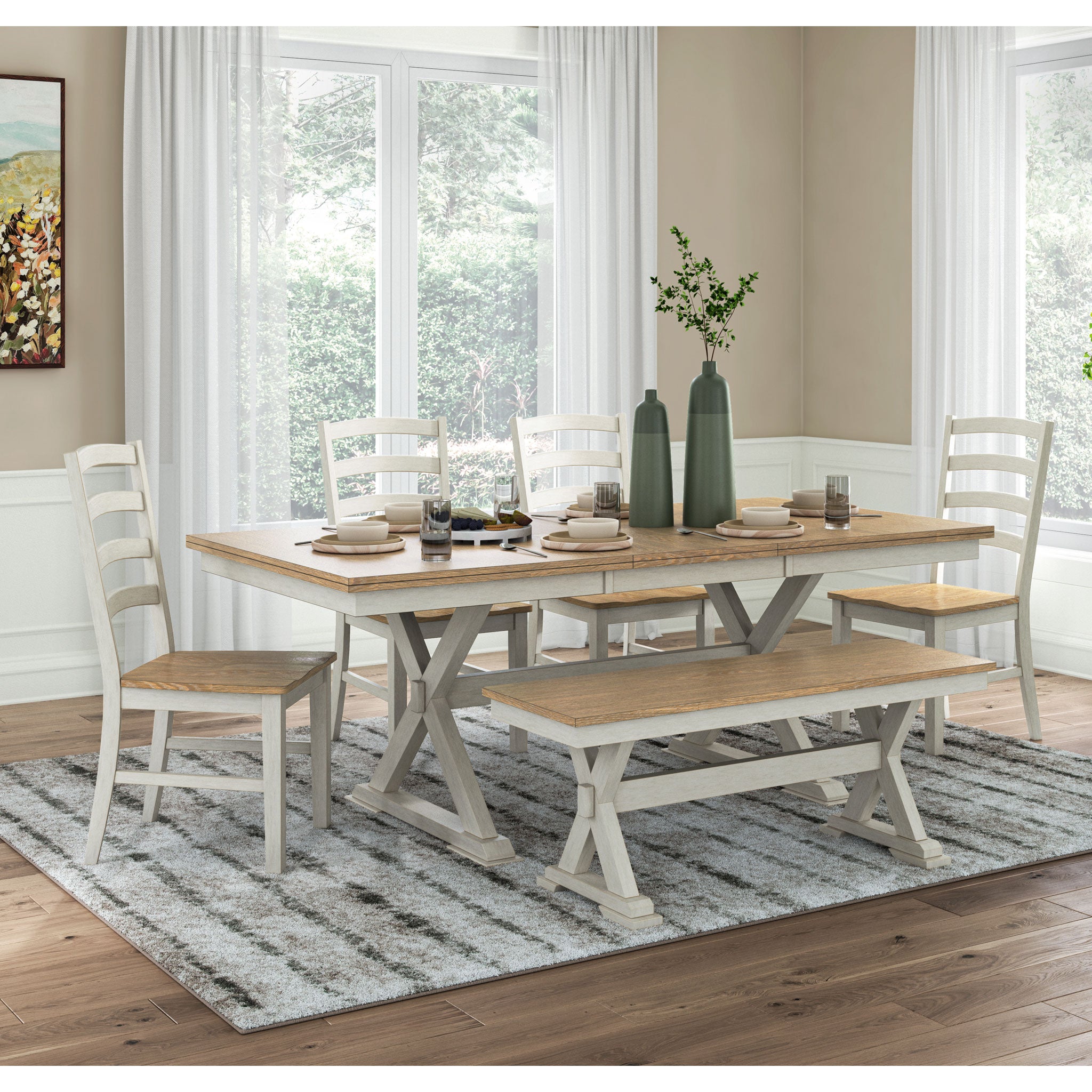 Busy breakfasts and family dinners get a dose of modern farmhouse flair with this dining bench. Its two-tone finish contrasts a light butcher block hue with antiqued white for an utterly charming effect. An effortless seating solution, the bench can tuck under your table to give you extra space to maneuver through the dining room.