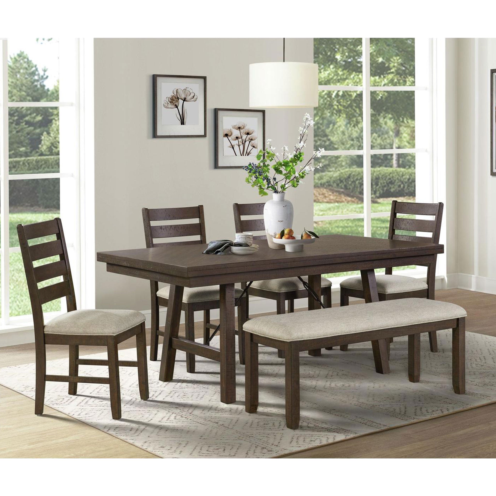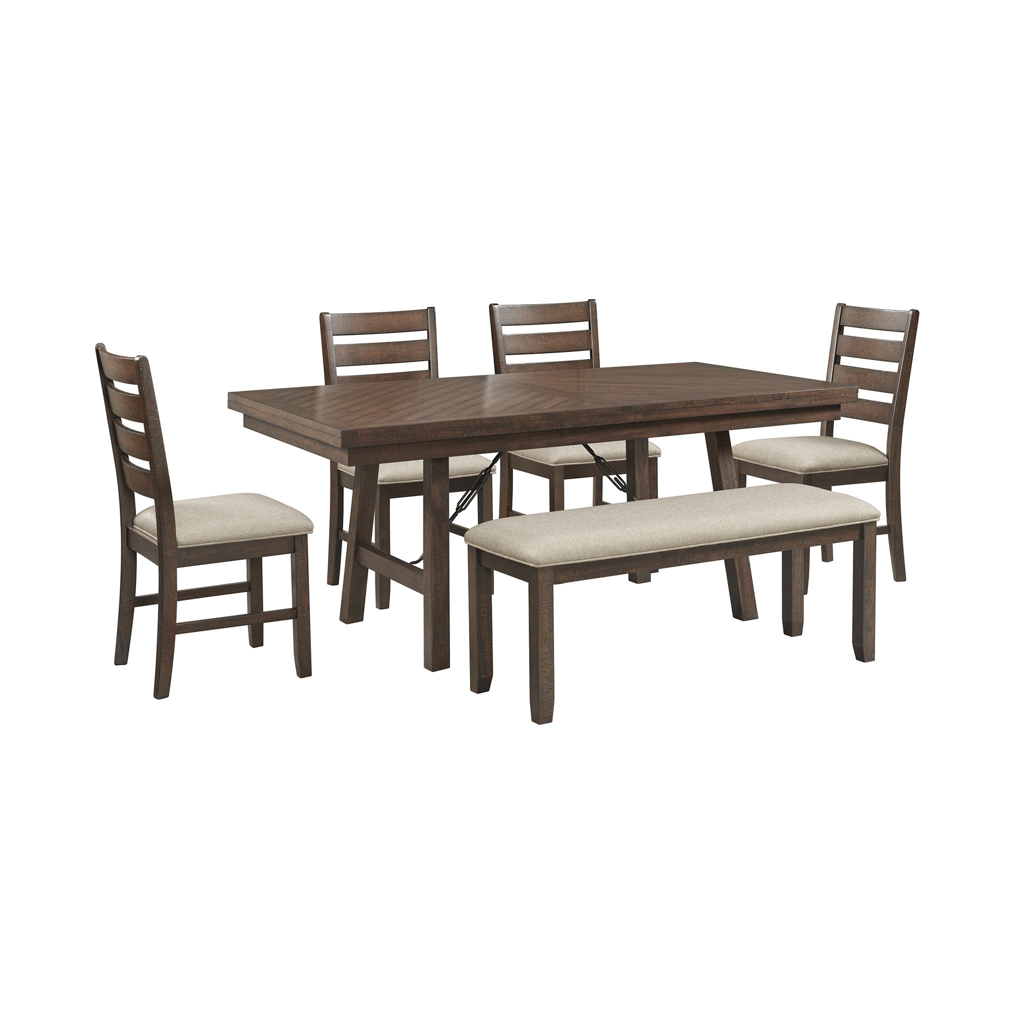 Bring timeless character to your dining space with the Jax 6-Piece Dining Set. Finished in a rich cherry tone, this set features a classic rustic farmhouse design with subtle distressed details that add vintage charm. The ladder-back chairs and matching bench are padded with seating for added comfort during meals or gatherings. This 6-piece set includes one table, four chairs, and one bench—perfect for everyday family dining or entertaining guests.