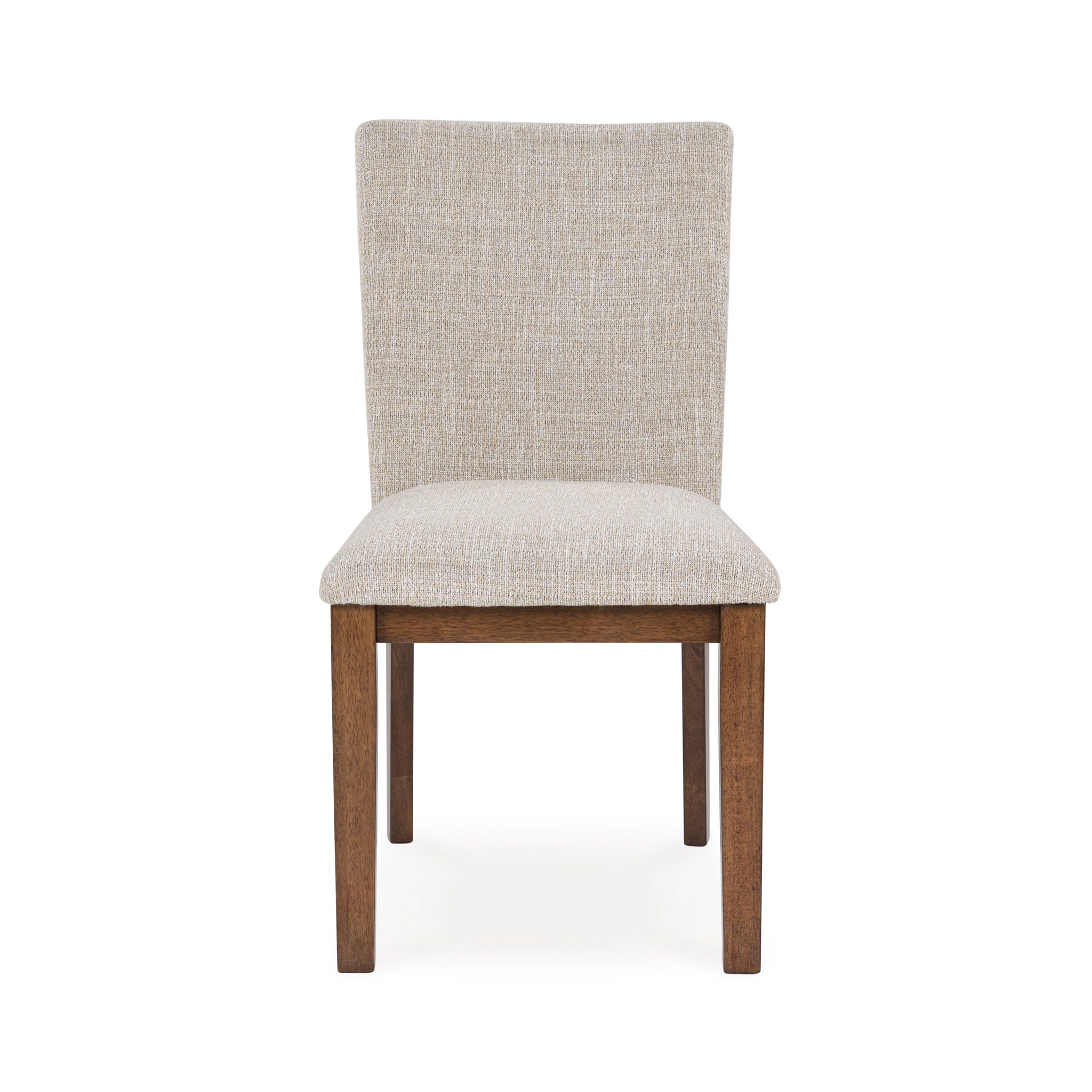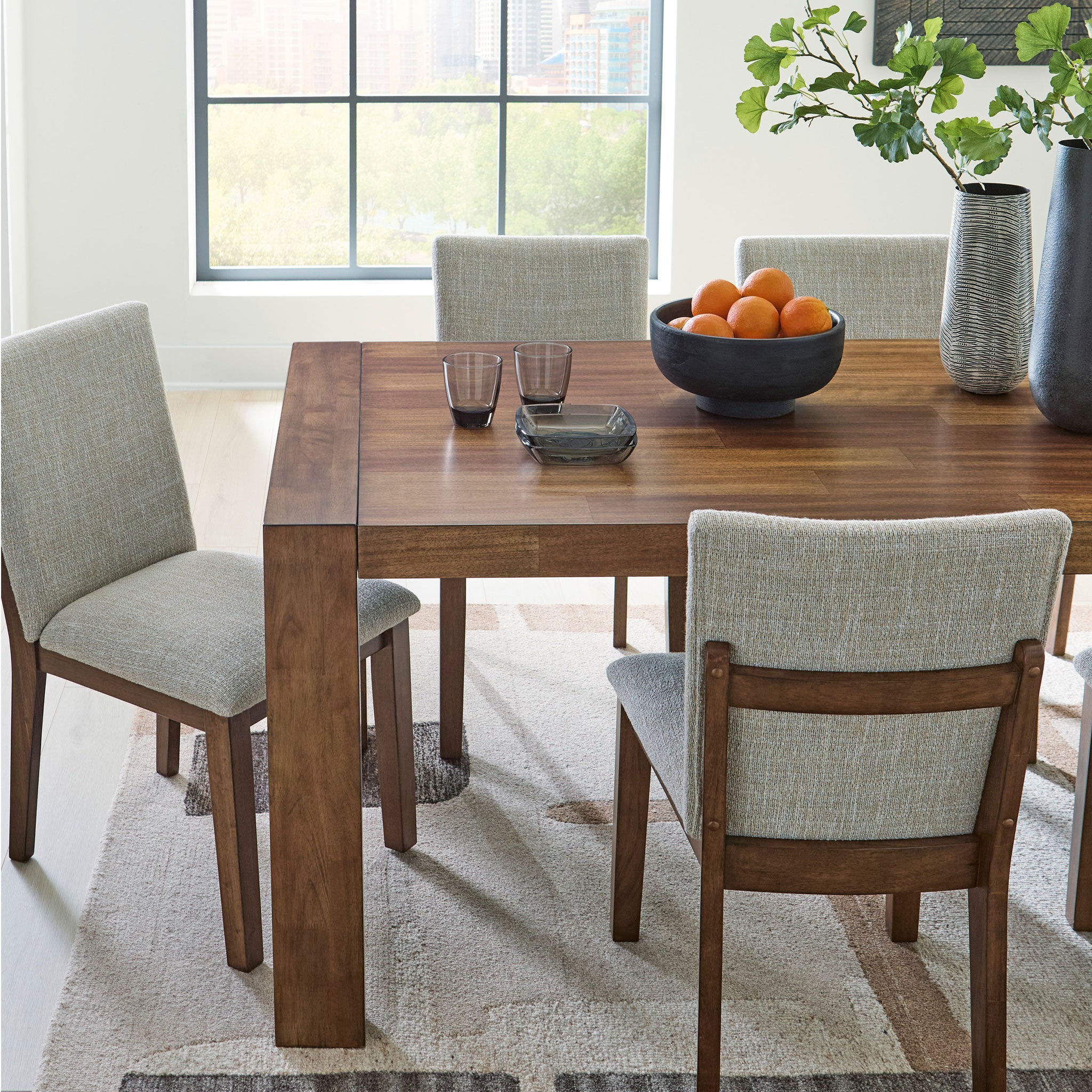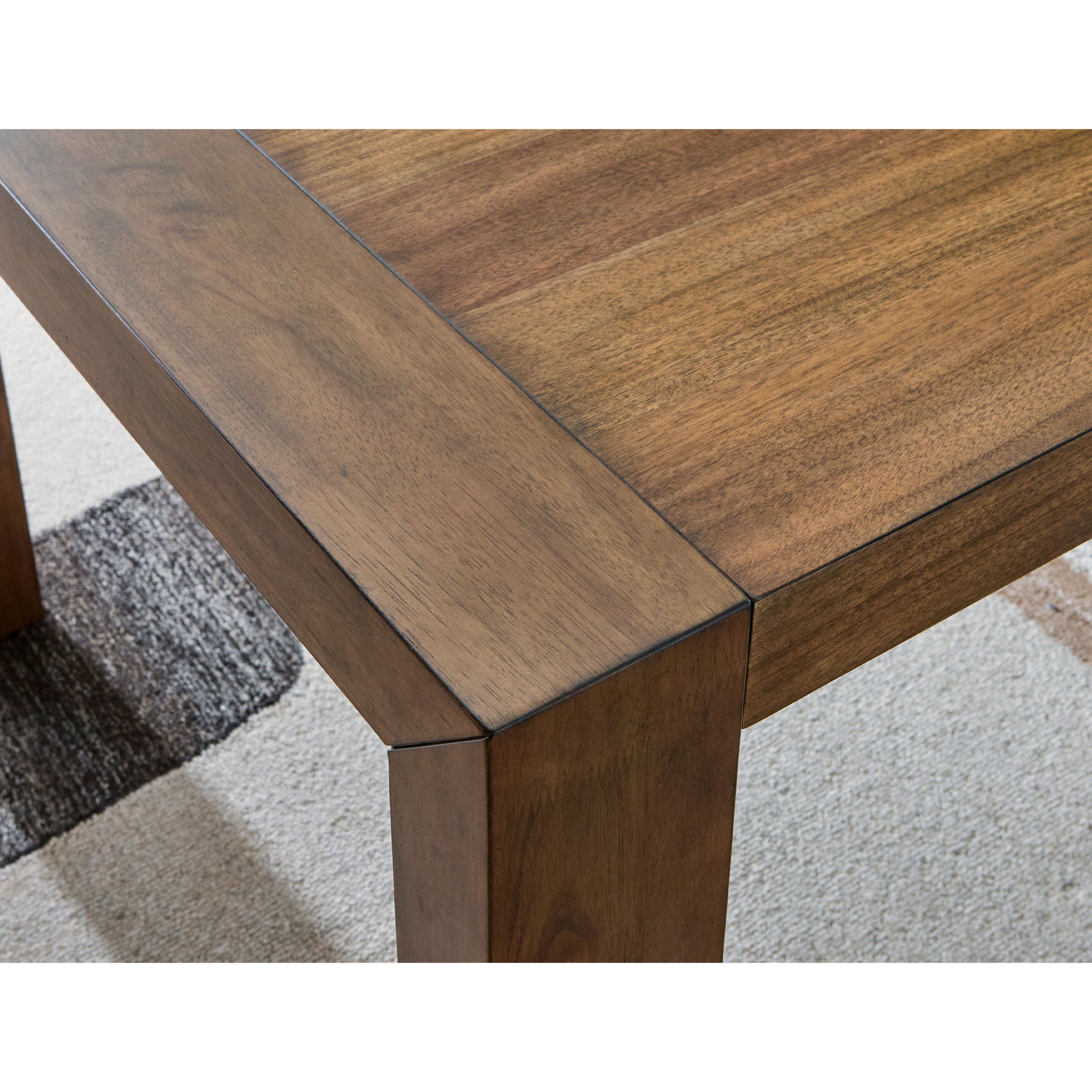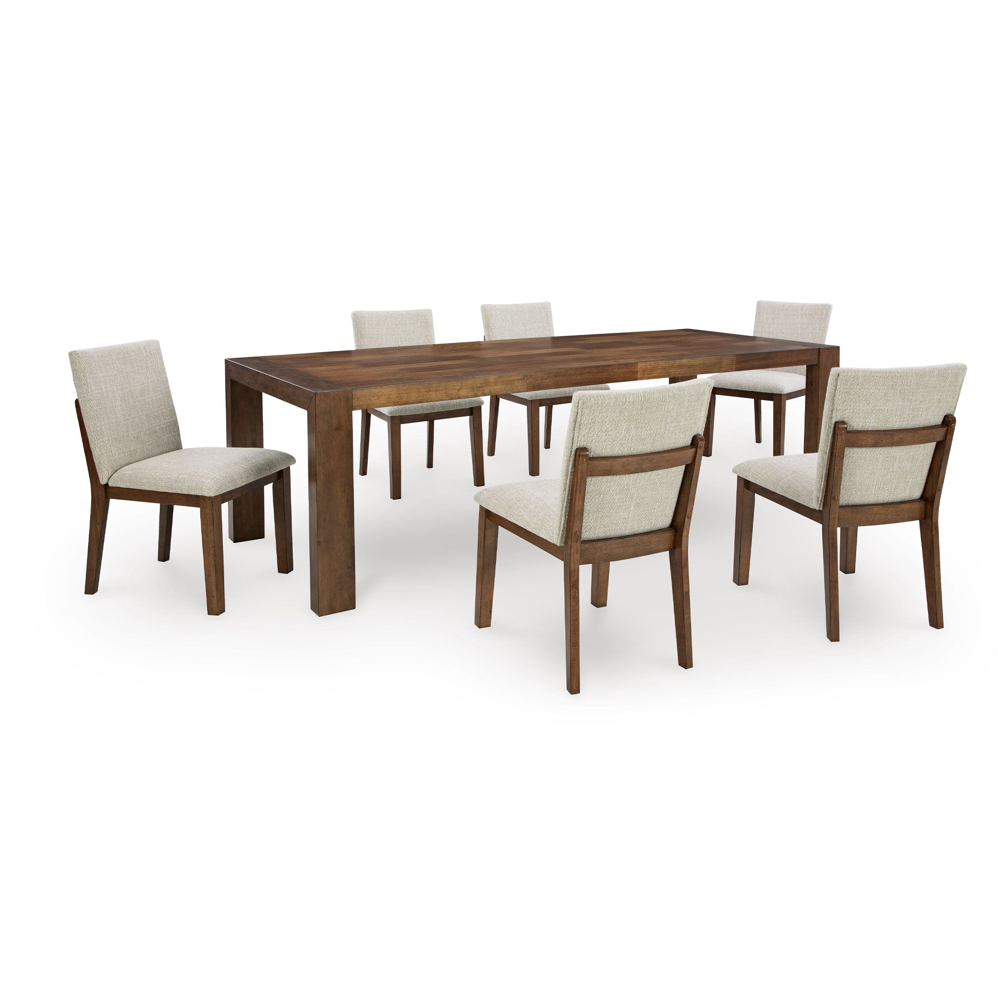 Casual lifestyle design. Made with hardwood solids, butcher block Mango wood veneer and MDF substrates. Finished in a rich brown wood tone that enhances the Mango wood butcher block veneers. The dining table features a clean contemporary styling with thick waterfall edge leg design and a 96" long butcher block veneer top for seating up to 8 comfortably. The stylish dining chair design features a solid wood frame and fully upholstered seat and back that is covered in a light beige colored Next-Gen Nuvella™ performance fabric.