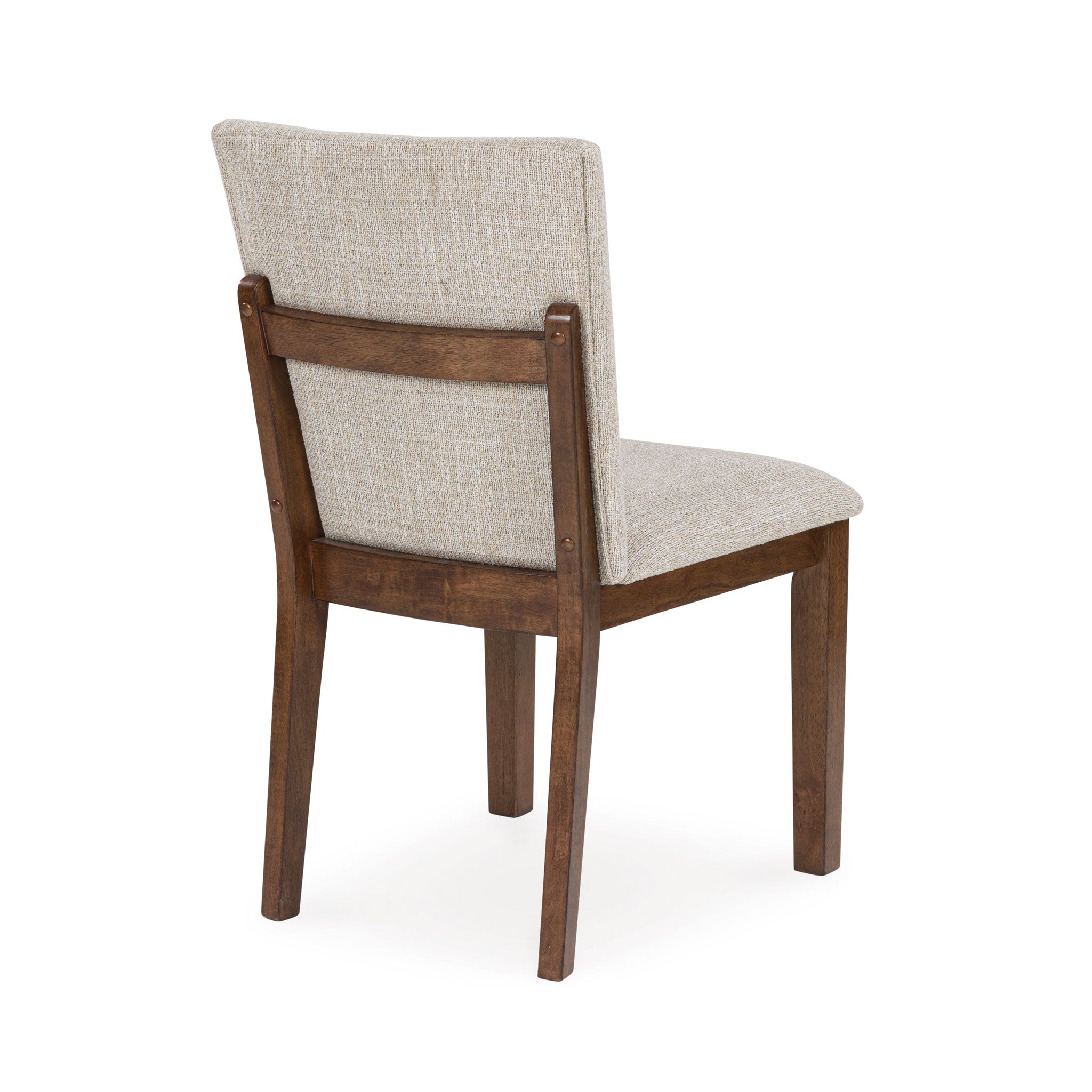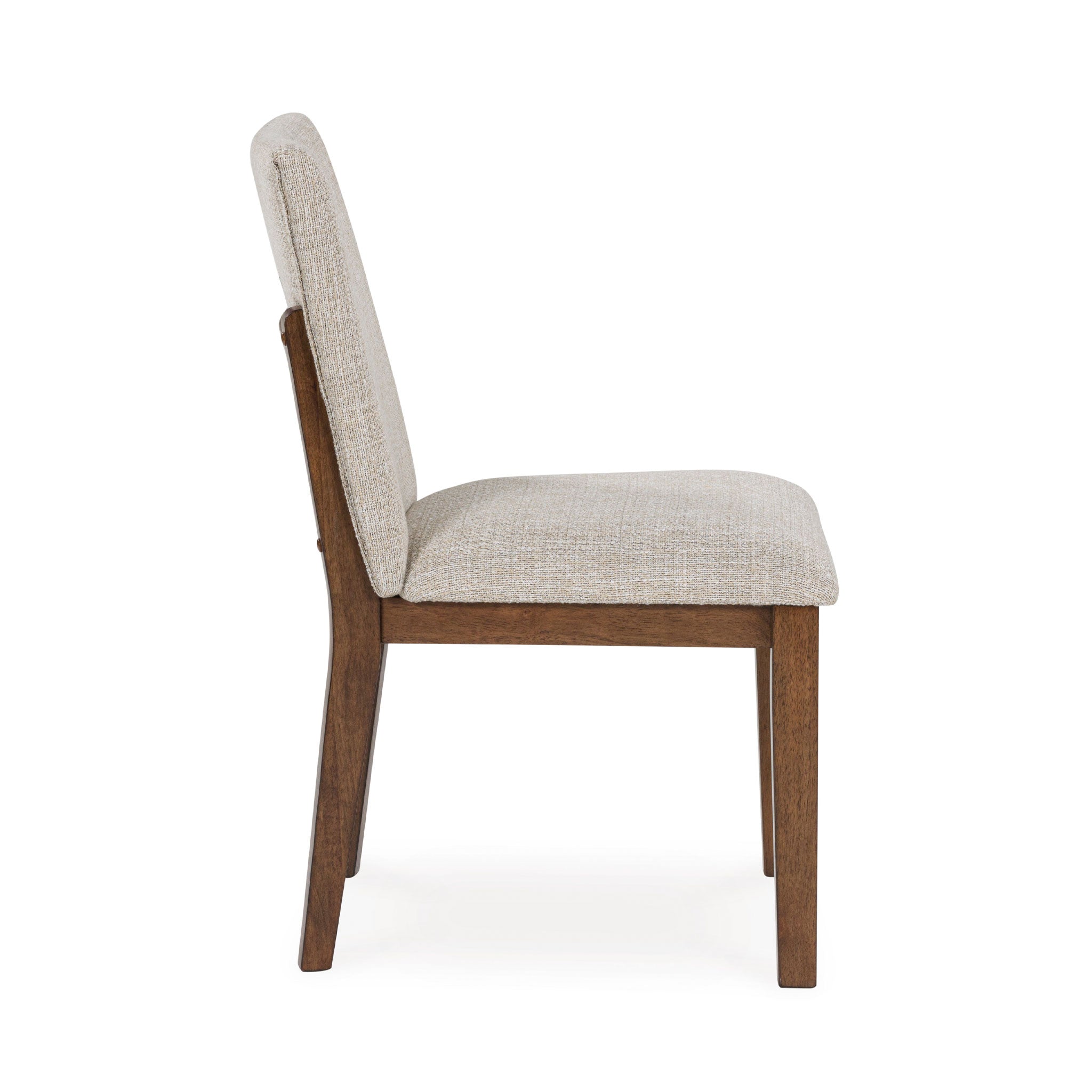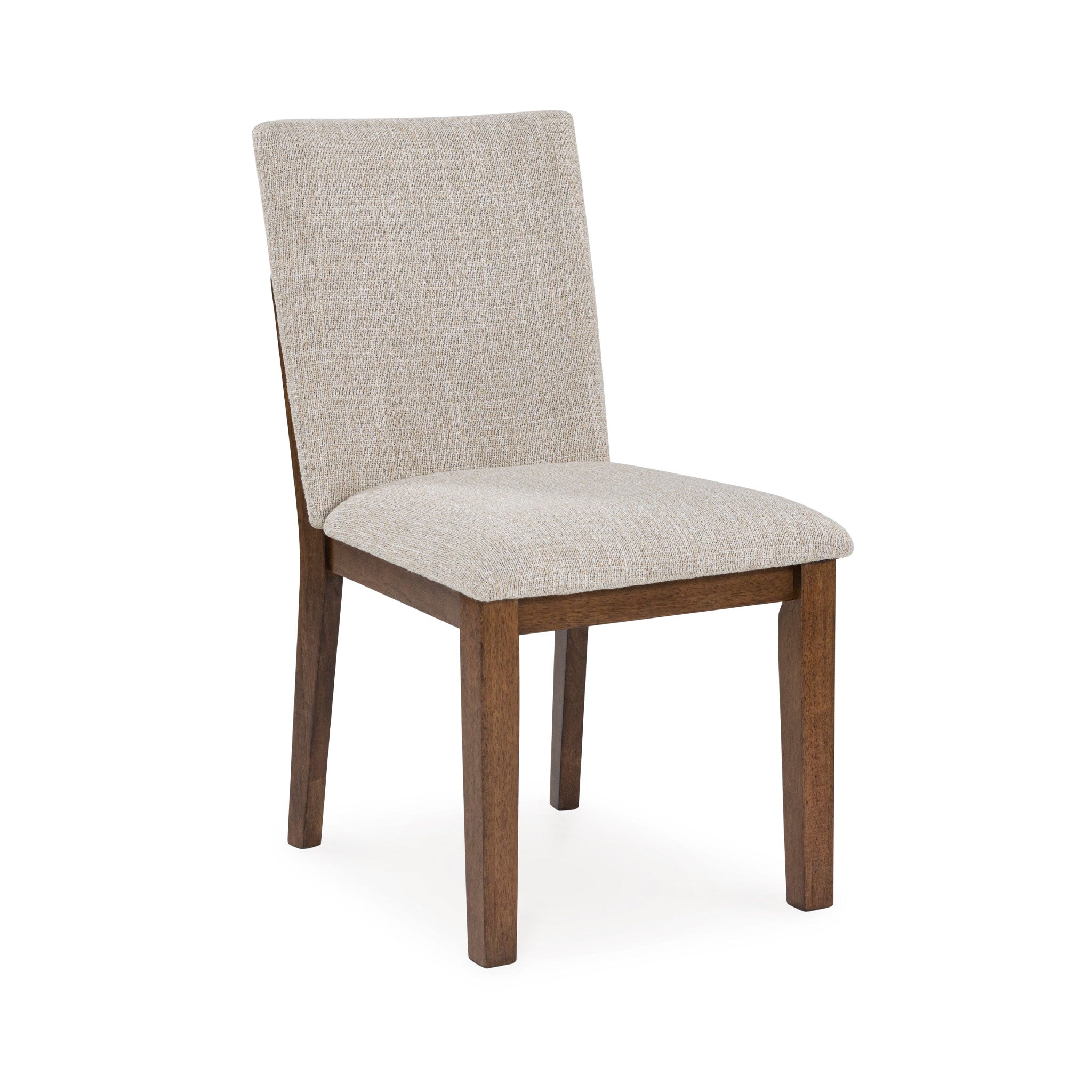 Casual lifestyle design. Made with hardwood solids, butcher block Mango wood veneer and MDF substrates. Finished in a rich brown wood tone that enhances the Mango wood butcher block veneers. The dining table features a clean contemporary styling with thick waterfall edge leg design and a 96" long butcher block veneer top for seating up to 8 comfortably. The stylish dining chair design features a solid wood frame and fully upholstered seat and back that is covered in a light beige colored Next-Gen Nuvella™ performance fabric.