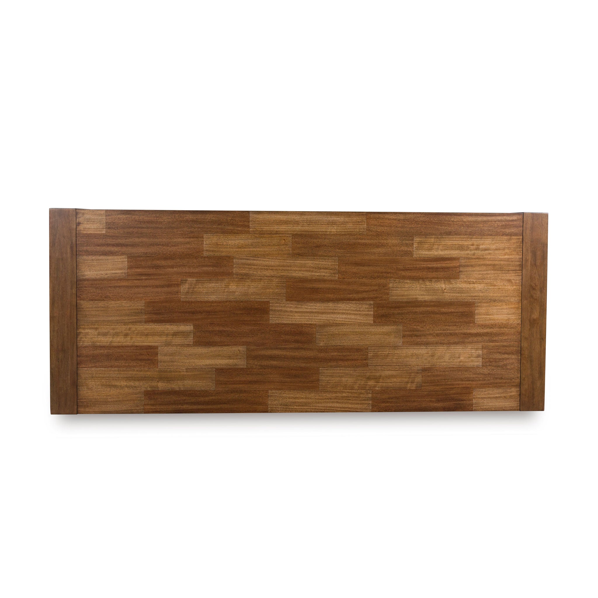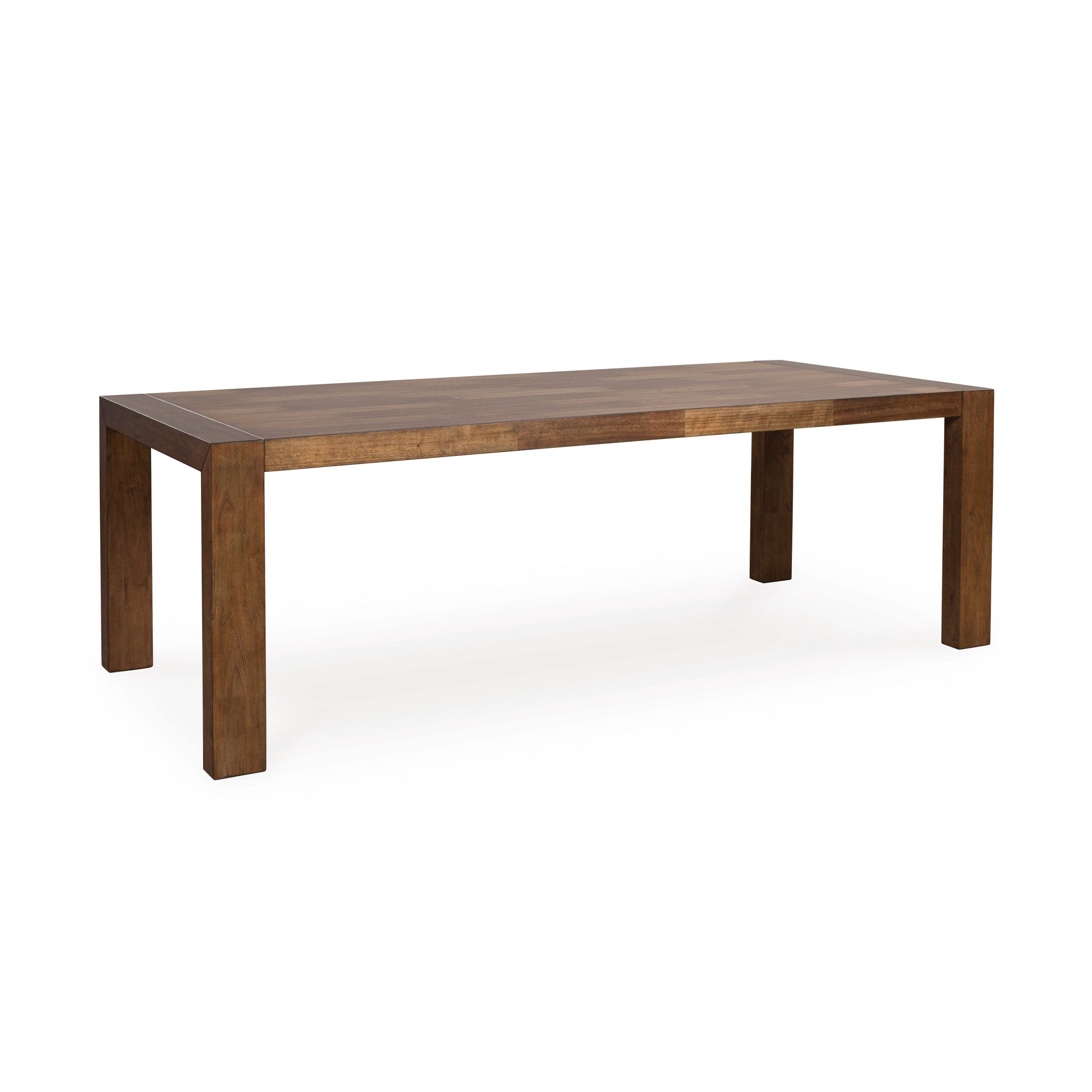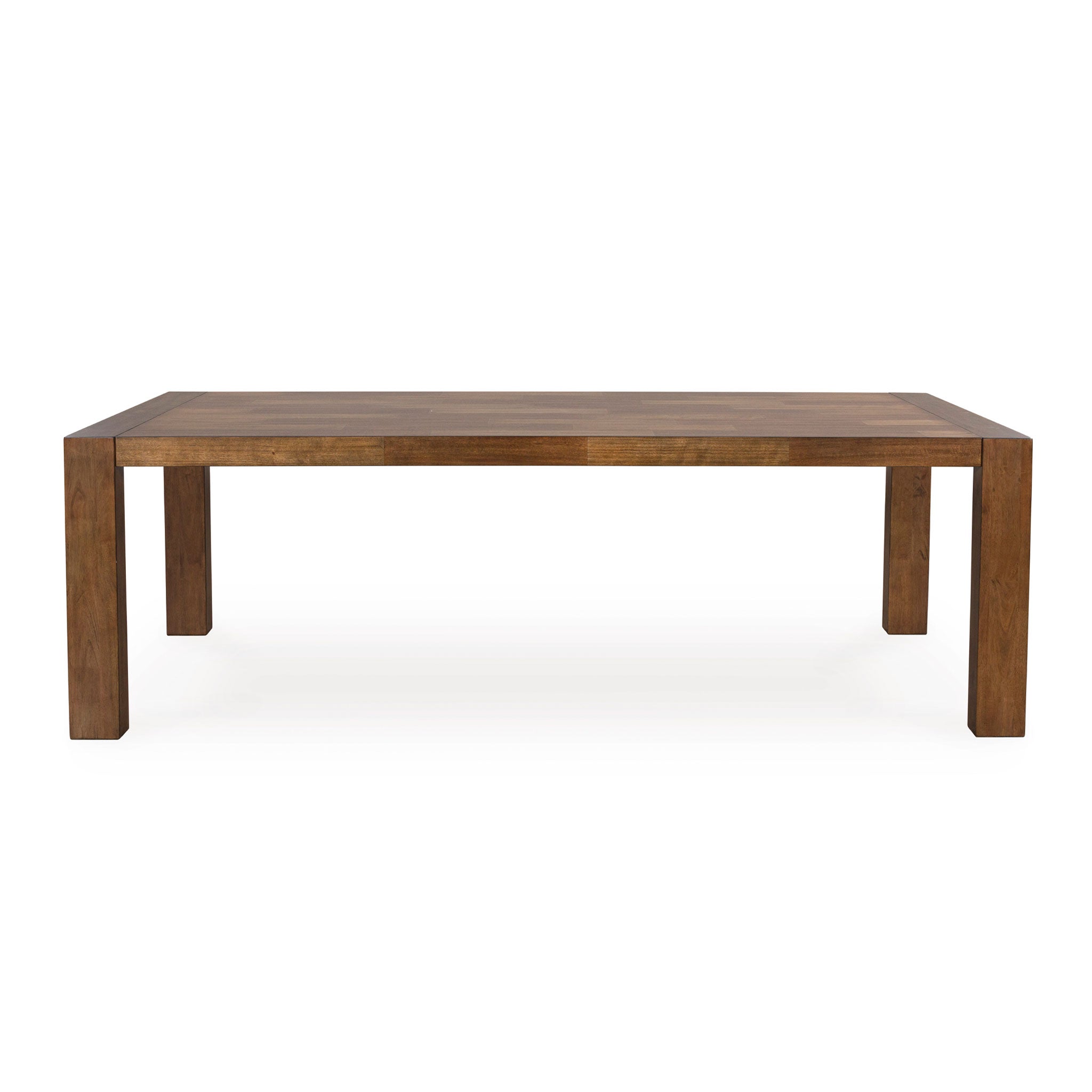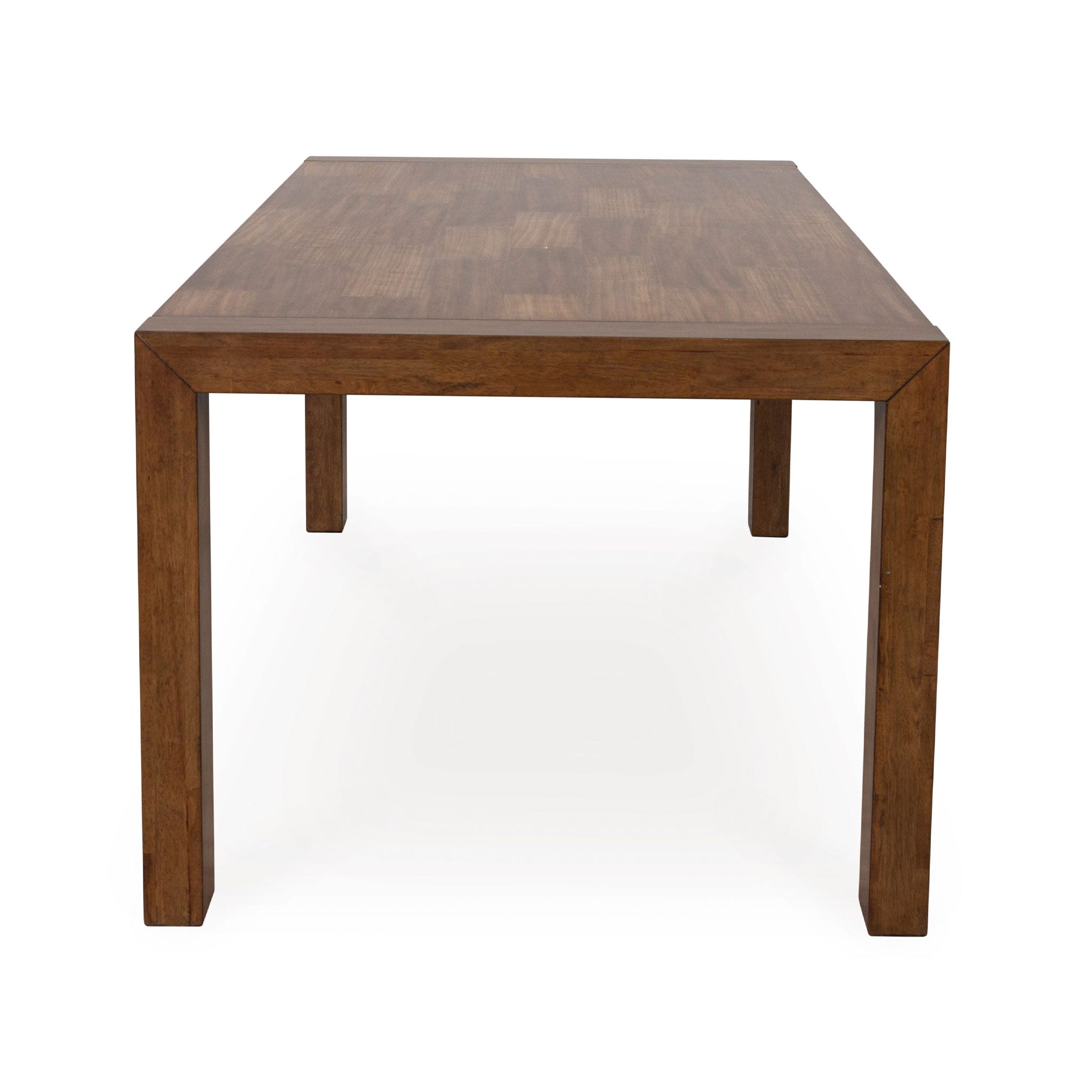 Casual lifestyle design. Made with hardwood solids, butcher block Mango wood veneer and MDF substrates. Finished in a rich brown wood tone that enhances the Mango wood butcher block veneers. The dining table features a clean contemporary styling with thick waterfall edge leg design and a 96" long butcher block veneer top for seating up to 8 comfortably. The stylish dining chair design features a solid wood frame and fully upholstered seat and back that is covered in a light beige colored Next-Gen Nuvella™ performance fabric.