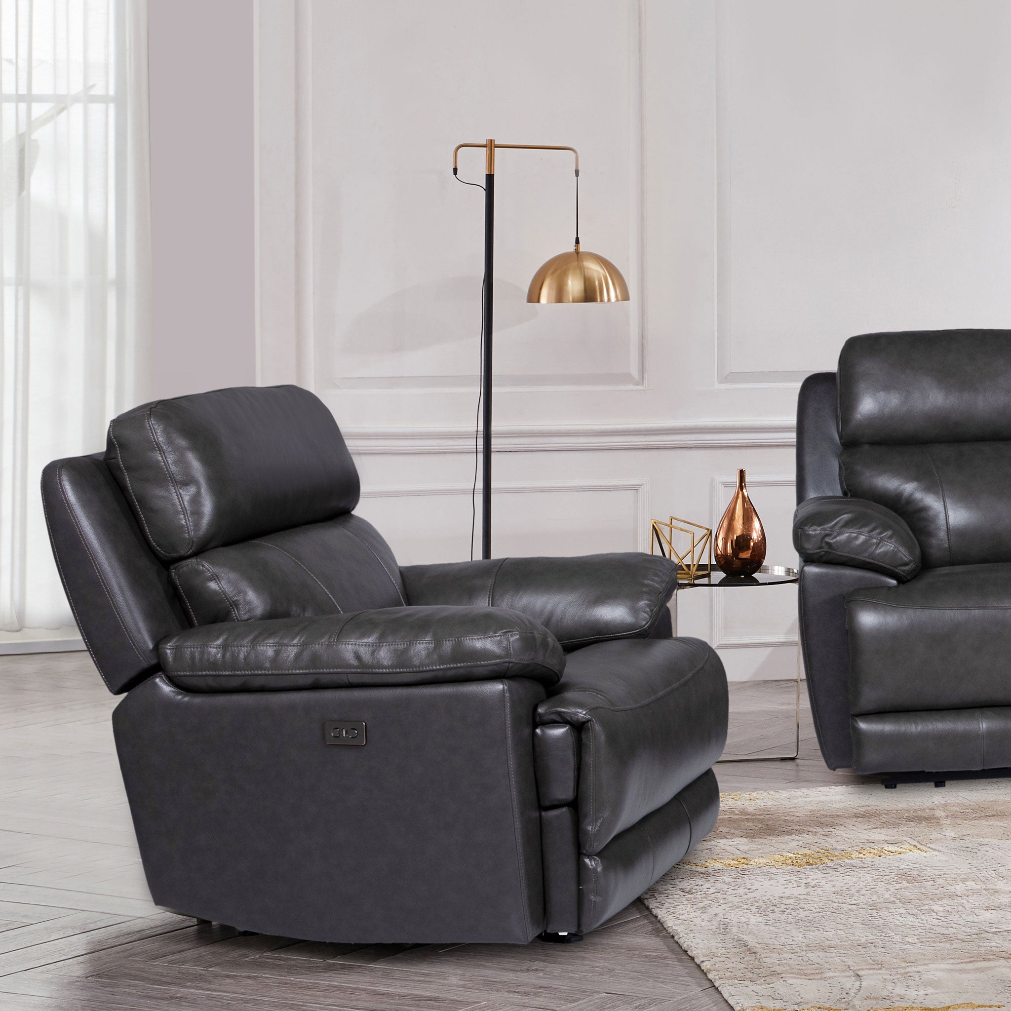 Settle into comfort with the Marley Leather Power Reclining Chair. Featuring power motion for smooth, adjustable relaxation, this chair is upholstered in supple Madrid Granite leather and finished with plush cushioning and supportive armrests. It’s a standout piece on its own or a perfect match to the Marley collection.