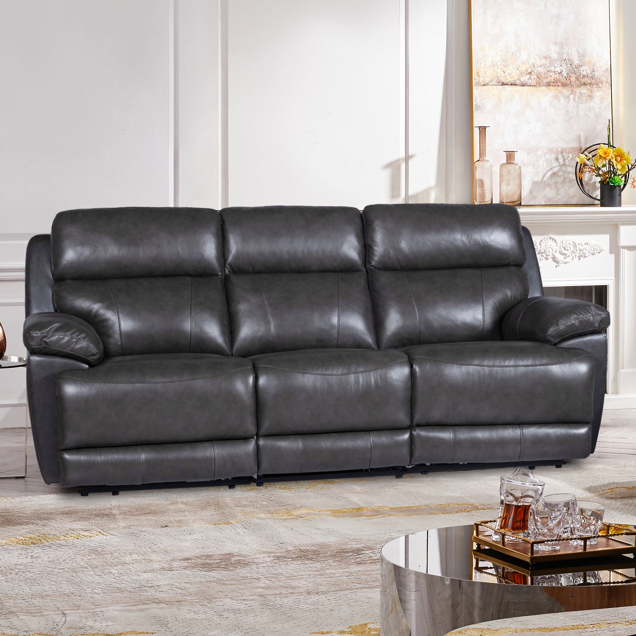 The Marley Leather Power Reclining Sofa brings sleek design and exceptional comfort to your living space. Upholstered in rich Madrid Granite leather, this three-seat sofa features smooth power reclining at the touch of a button. Generous padding, high-back cushions, and deep seating provide lasting support, while the clean silhouette complements both modern and transitional décor.