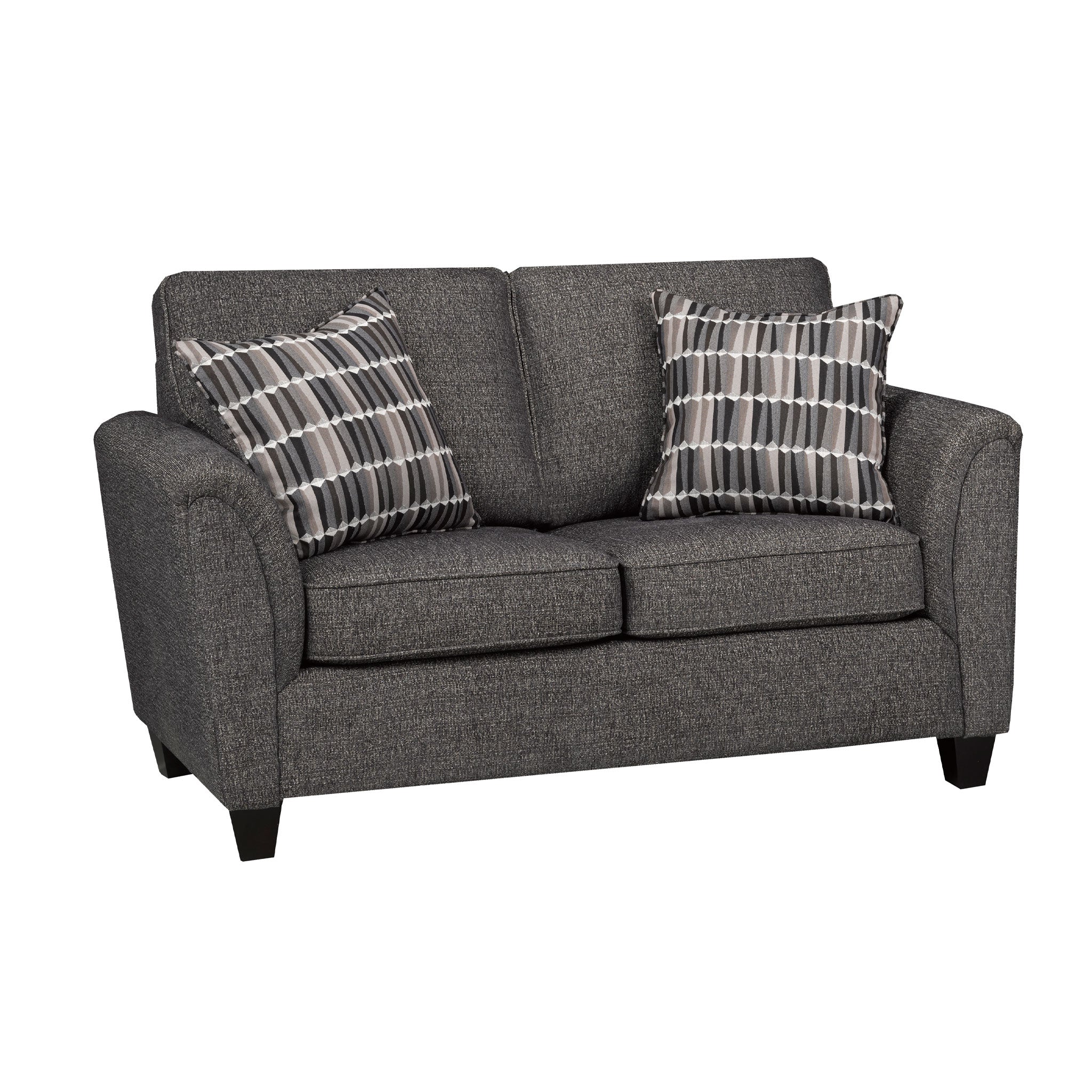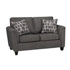 The Franklin Loveseat in Charcoal offers the same comfort and style as the sofa in a compact size. Plush cushions and supportive pillows make it ideal for small spaces or paired with the Franklin Sofa. Its neutral color and modern design suit a variety of room styles, while durable fabric ensures long-lasting use. A lighter grey option is available in-store.