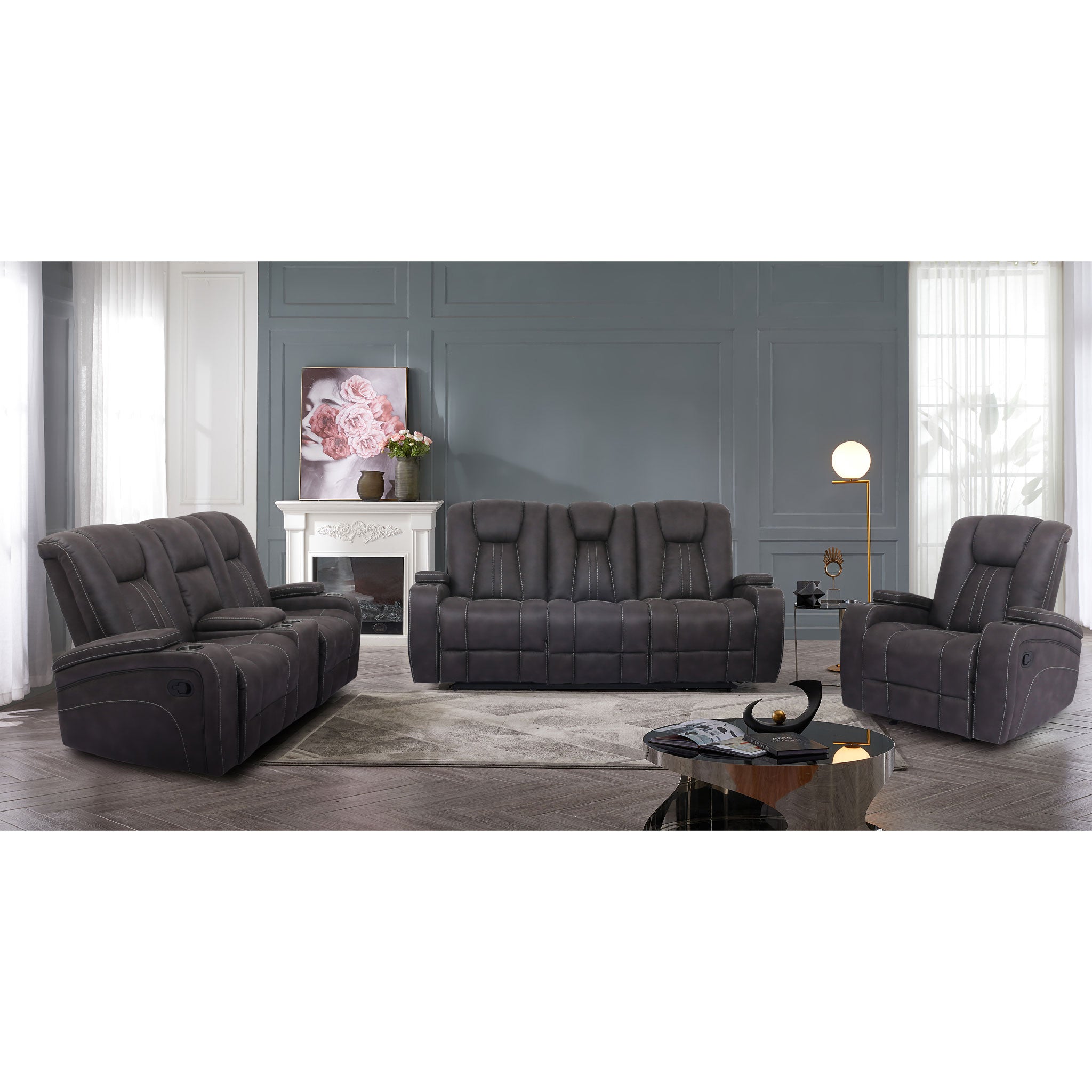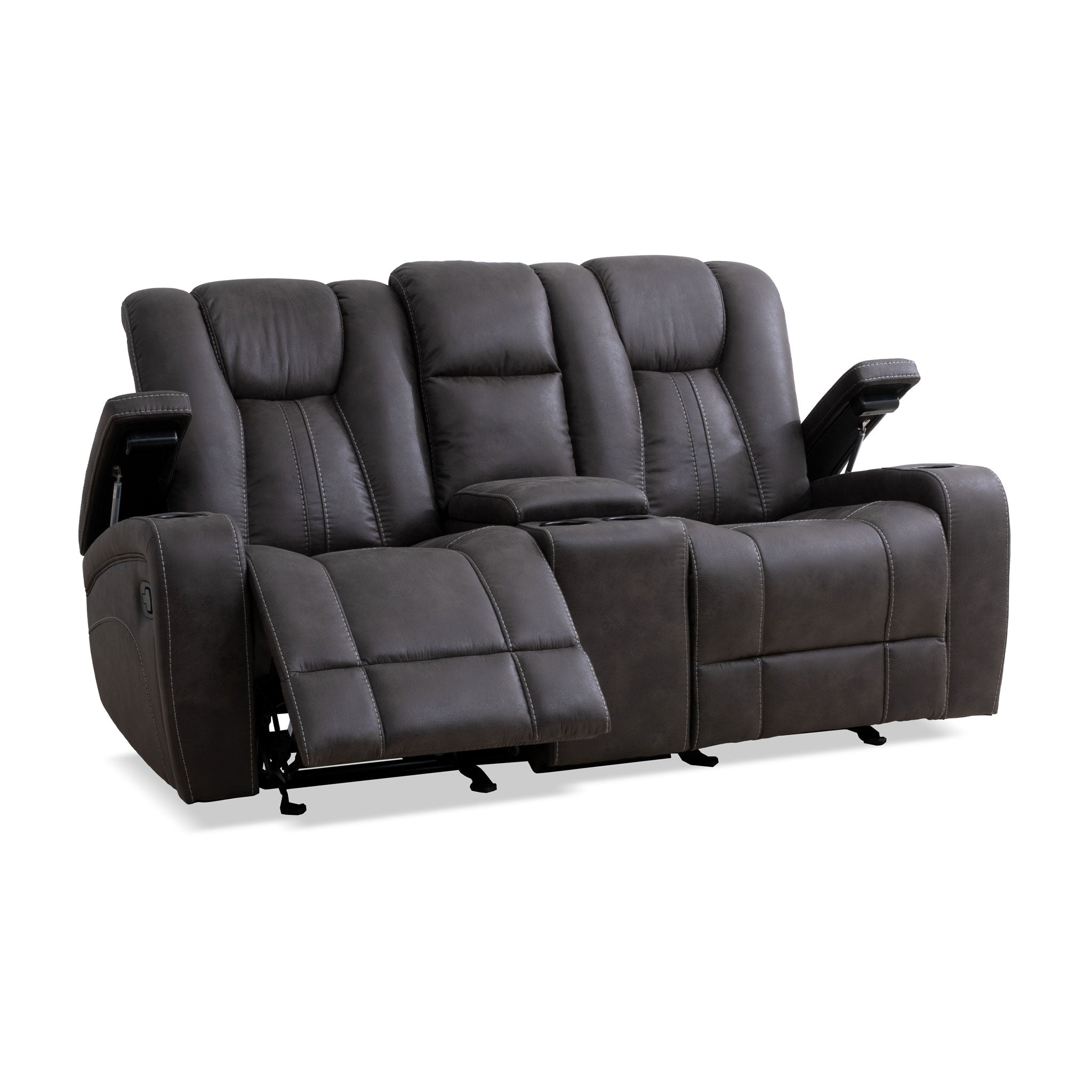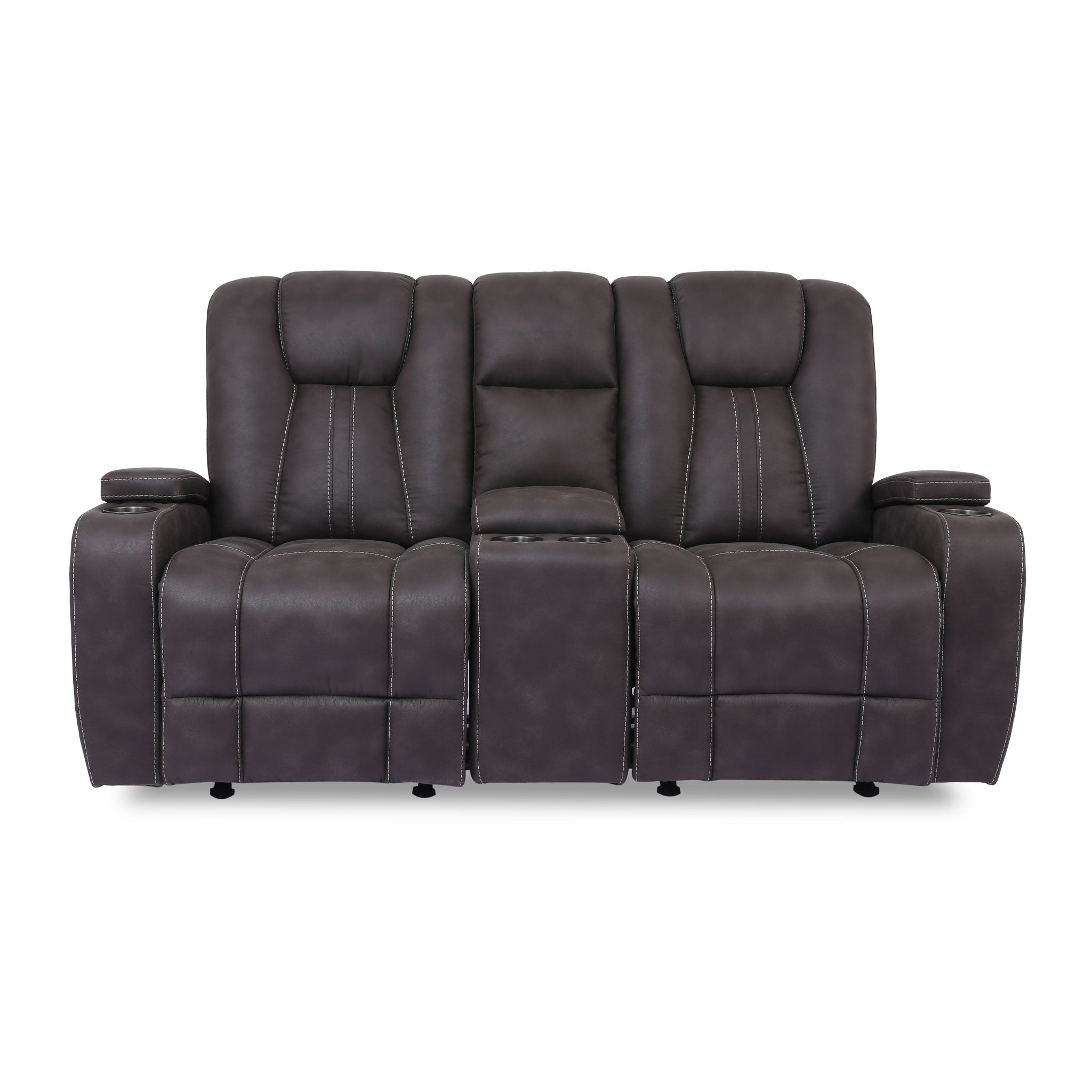 The Parker Manual Glider Loveseat with Console offers the same comfort and functionality in a more compact size. Upholstered in Cowboy Granite, it includes a manual recline for customized support. Its clean design fits easily into a variety of room layouts. Please note: there may be a slight shade variation in the fabric from the images shown.