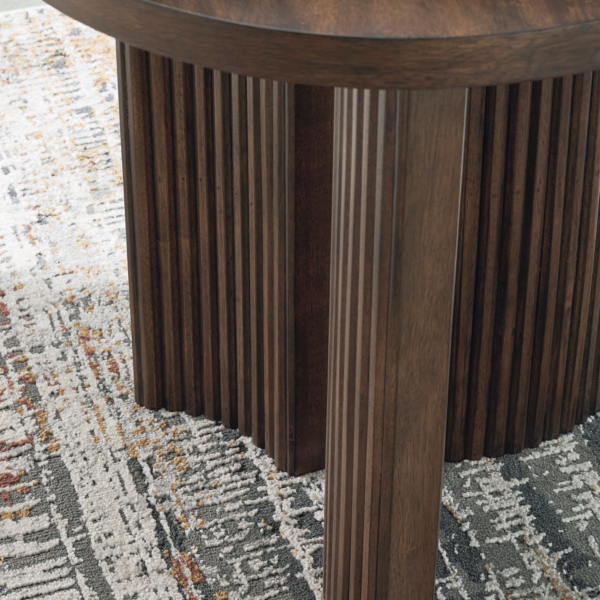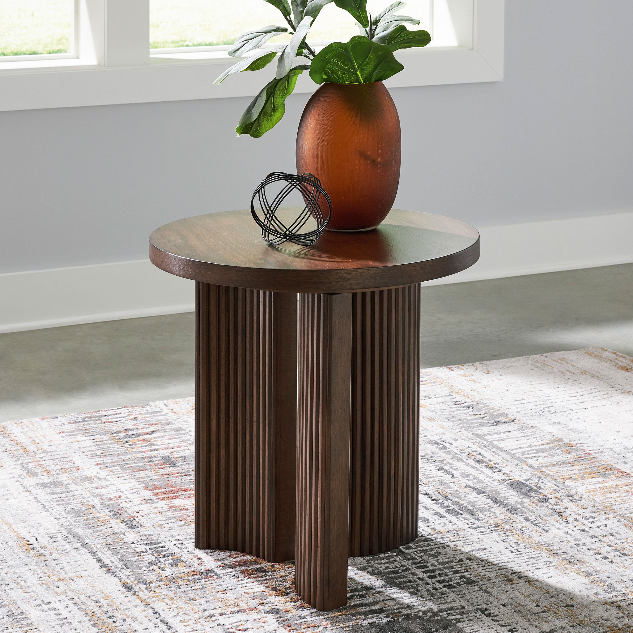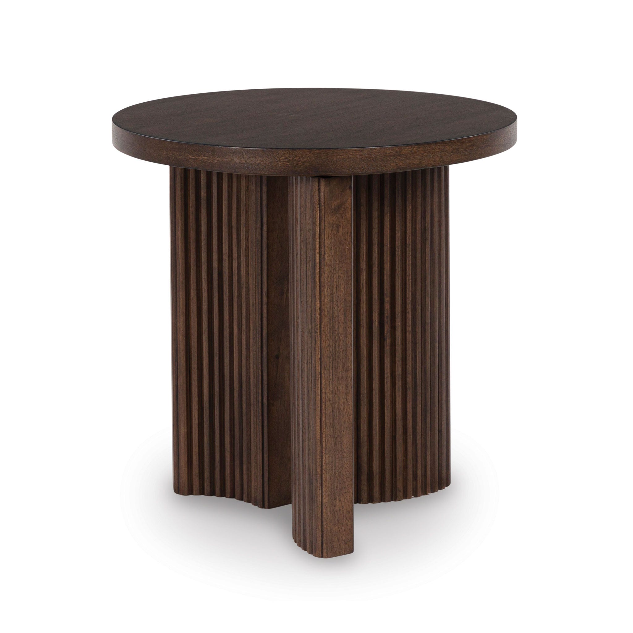 This end table exemplifies casual contemporary design with an urban vibe. Its rich brown finish is warm and inviting, and decor looks that much sleeker when displayed on the thick tabletop. A trend-right reeded base subtly nods to mid-century modern design. What a stunning reflection of your simple-meets-elegant sensibility.