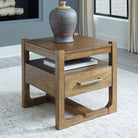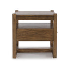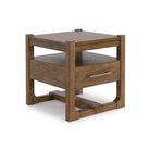 This end table sits comfortably at the intersection of modern lodge and farmhouse aesthetics. Your warm and welcoming disposition is reflected in the charming architectural elements and light brown glazed finish. Even with its poise, this table remains practical. A drawer and unique open shelf design encourage you to store and display in style.
