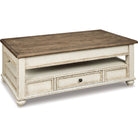 This lift top coffee table is traditional cottage styling taken to a new level. Antiqued two-tone finish blends a chipped white with a distressed wood finished top for a double serving of charm. Crafted with quality dovetail construction, this coffee table with drawer and open shelf space melds function with exceptional form.