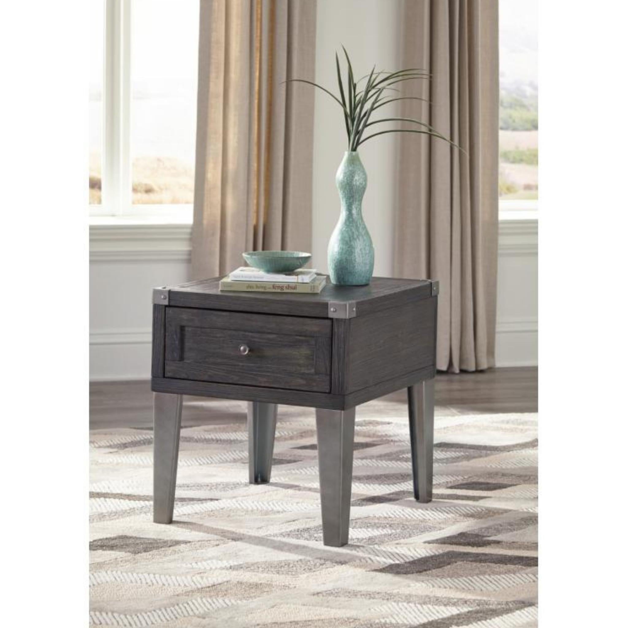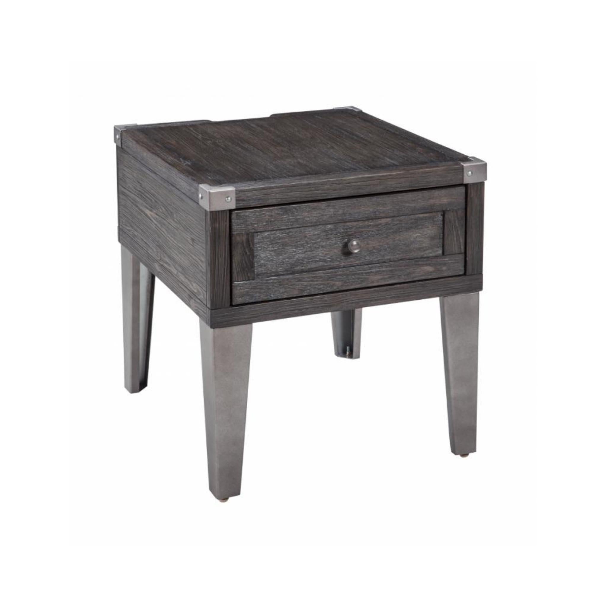 Take a stance for rustic-industrial style with this mixed material end table. Weather-washed pine wood and veneers are contrasted with canted metal legs and corner bracket accents for a uniquely chic merger of earthy beauty and contemporary flair. Power plug-ins and USB charging ports mounted on the back add practical function to great form.