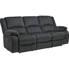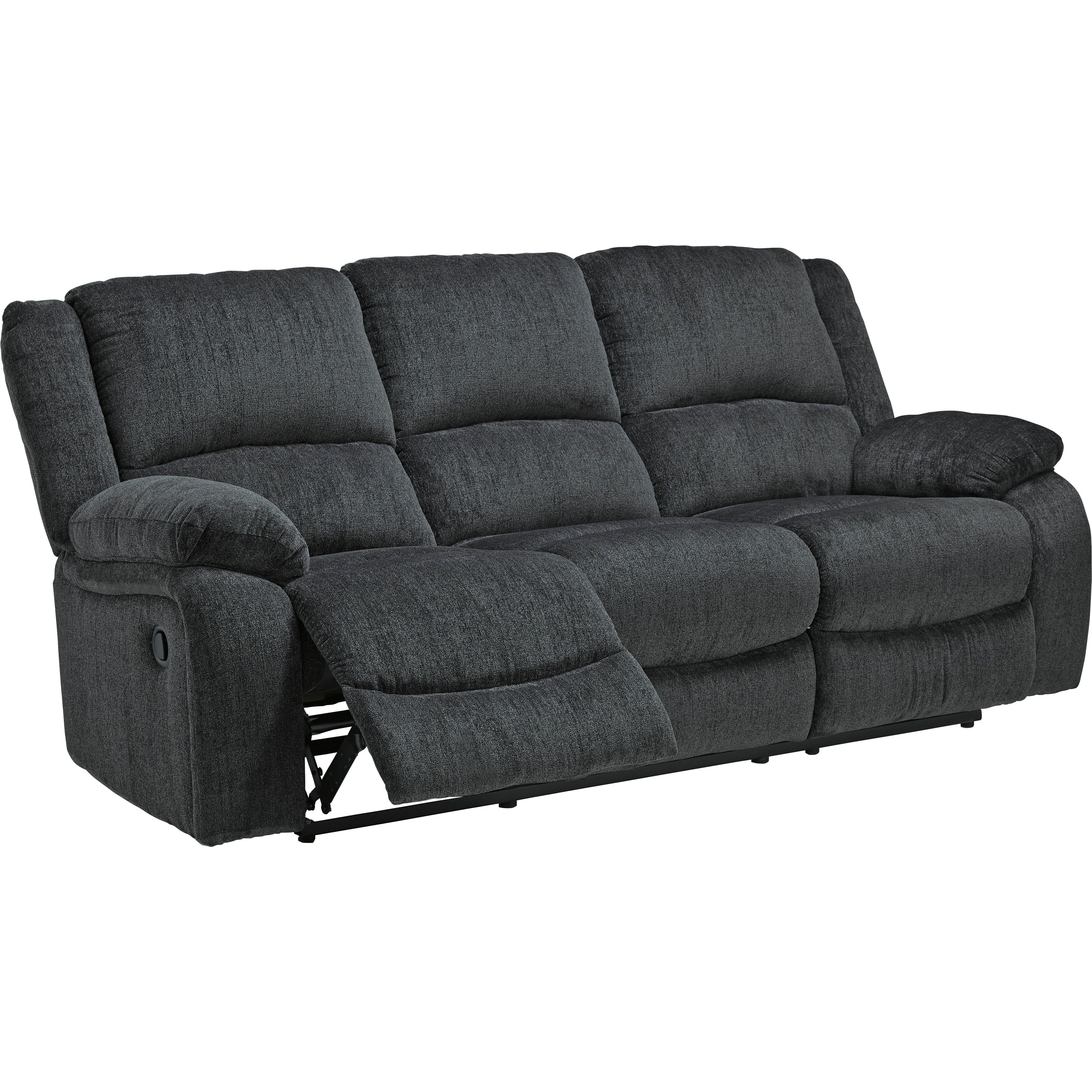 Dual-sided recliner; middle seat remains stationary Pull tab reclining motion Corner-blocked frame Attached cushions High-resiliency foam cushions wrapped in thick poly fiber Polyester upholstery The Draycoll reclining sofa is a classic grey sofa with comfortable seating that your whole family will enjoy. This sofa will blend perfectly with any family room or living room style.
