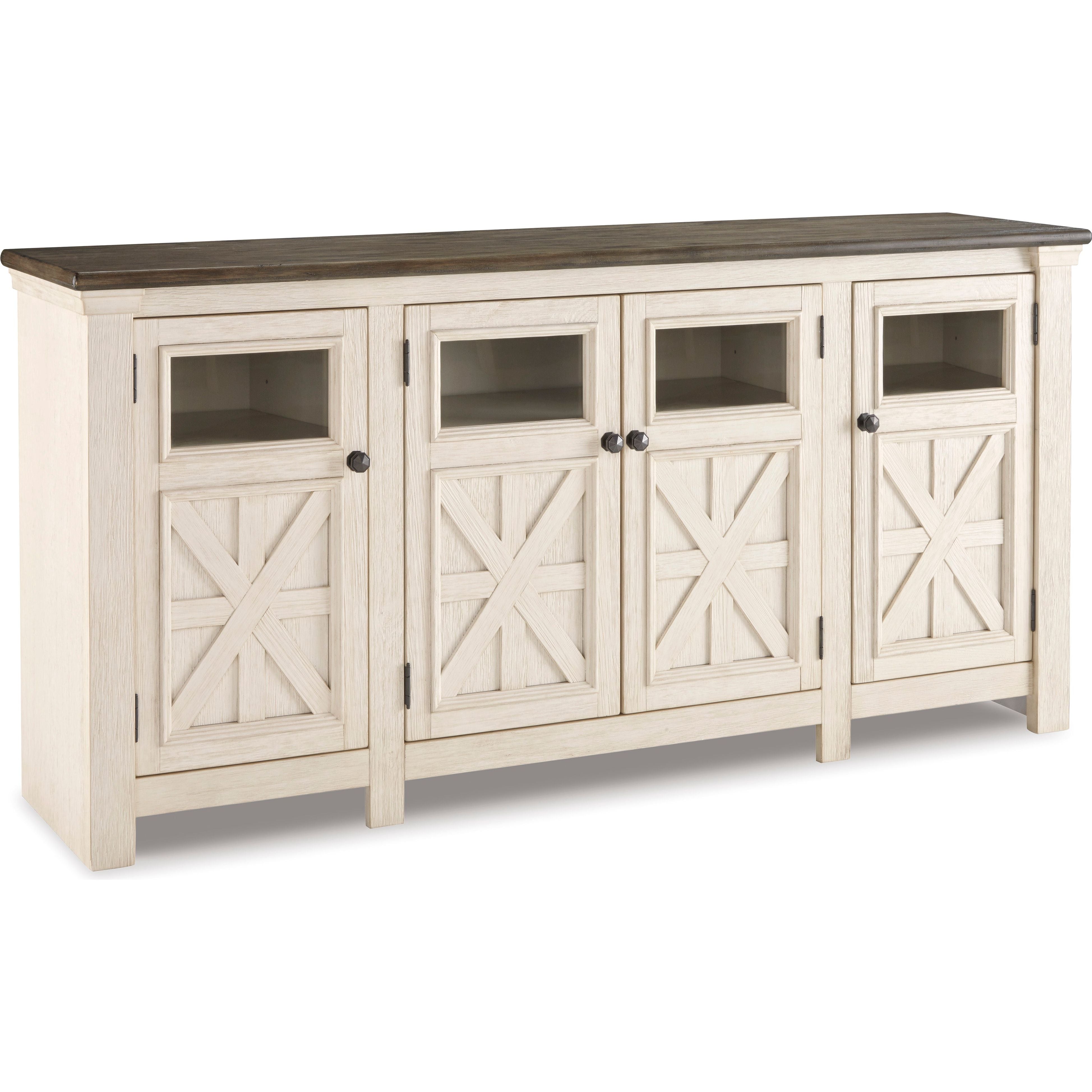 Whether your style is farmhouse fresh, shabby chic or country cottage, you’ll find this extra large TV stand perfectly in tune. Its two-tone, gently distressed finish pairs weathered oak with antiqued white for that much more quaint character. Charming elements include crossbuck adorned cabinets with glass inlays for peek-through flair. Ample adjustable shelving and cutouts for wire management nicely accommodate your media needs.