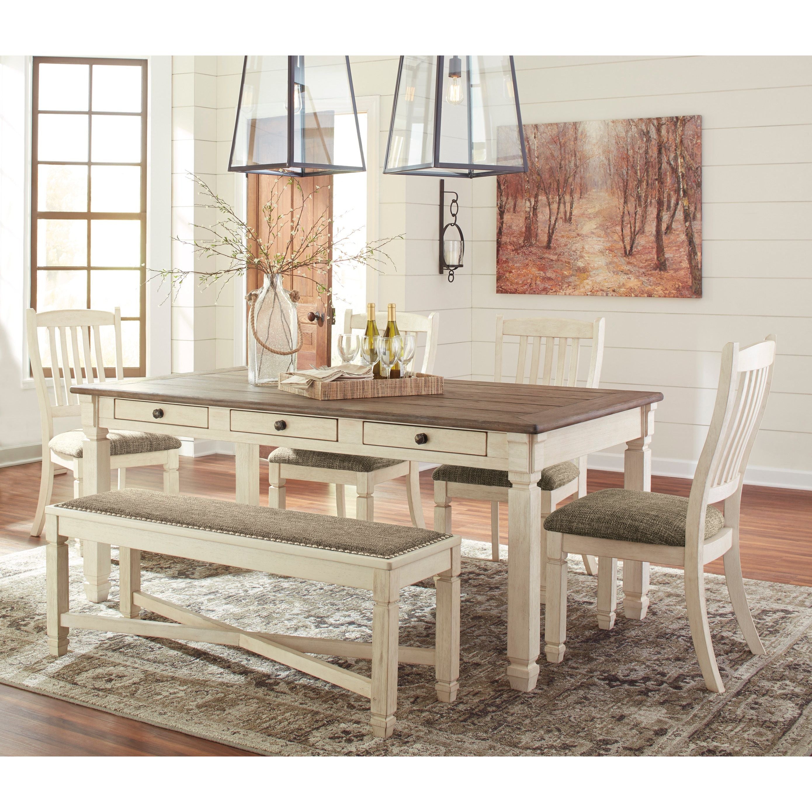 Enjoy beautiful cottage style with this classic dining table set. With a rustic planked top, this table serves up casual with a vintage twist. The gently distressed tabletop, paired with the rake-back design of the chairs and upholstered benches in a textured antique white finish, is a perfect set for impromptu gatherings. With six built-in drawers, you can keep placemats, napkins and utensils on hand for maximum practicality in any living space. For a quaint ensemble you're bound to love, choose this Bolanburg set.