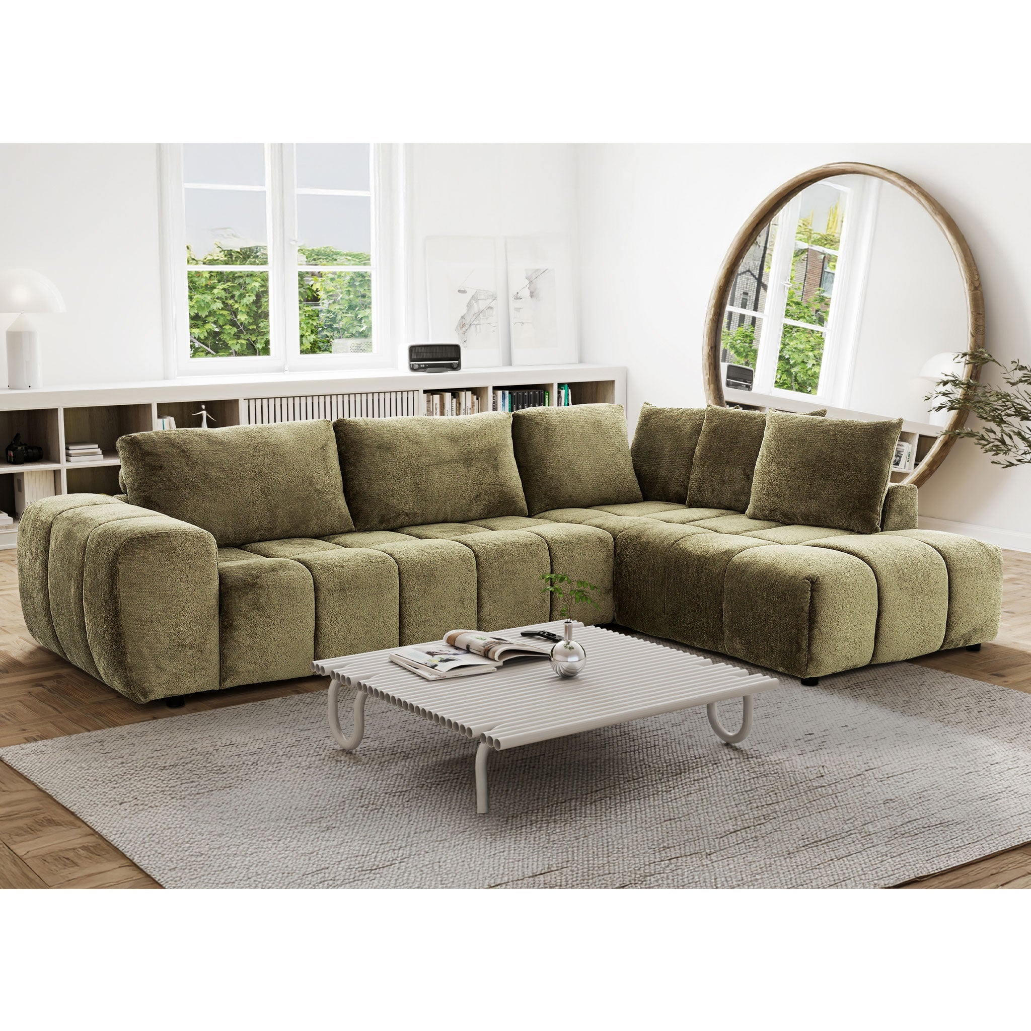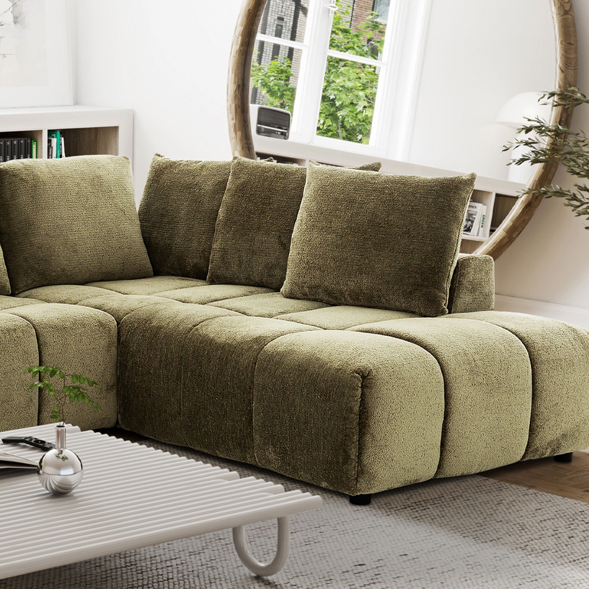 The Ciello Fabric Sectional brings a perfect balance of style and comfort to any modern living room. Its luxurious Bev Saige fabric in a striking green hue adds a bold yet elegant touch, making it a standout piece in your space. Whether you're entertaining guests or enjoying a quiet evening, this sectional combines contemporary design with everyday functionality.