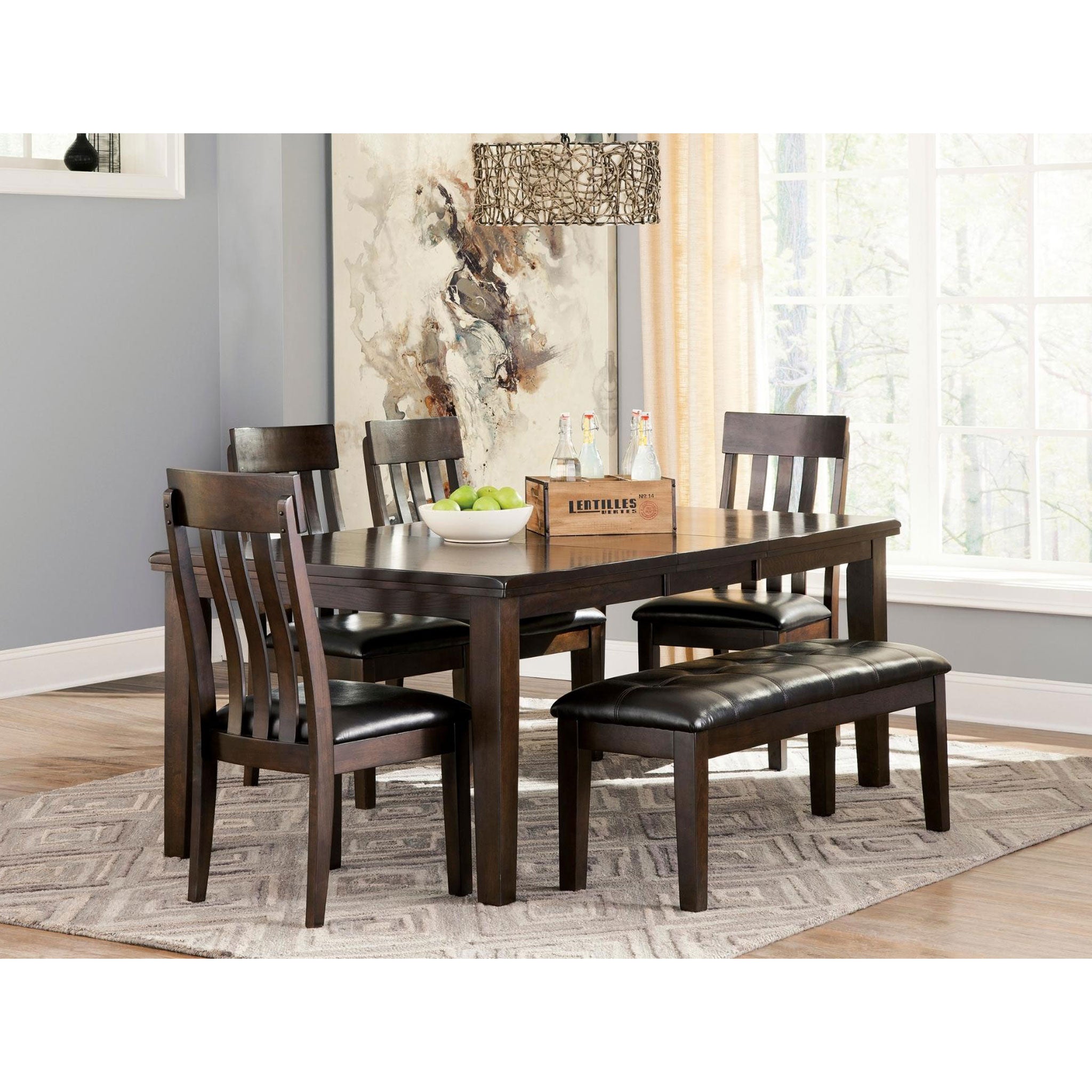 Take clean-lined, classic styling. Add modern comfort. Top with a deep, complex finish that exudes rich sophistication. That’s the look and feel of this dining table set with built-in butterfly leaf extension to accommodate guests. Four rake-back upholstered chairs and a cushioned bench with button-tufted seat make it complete.