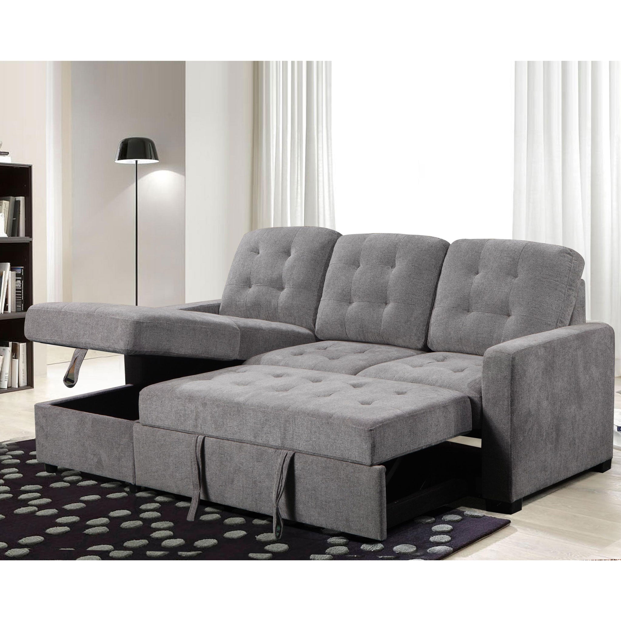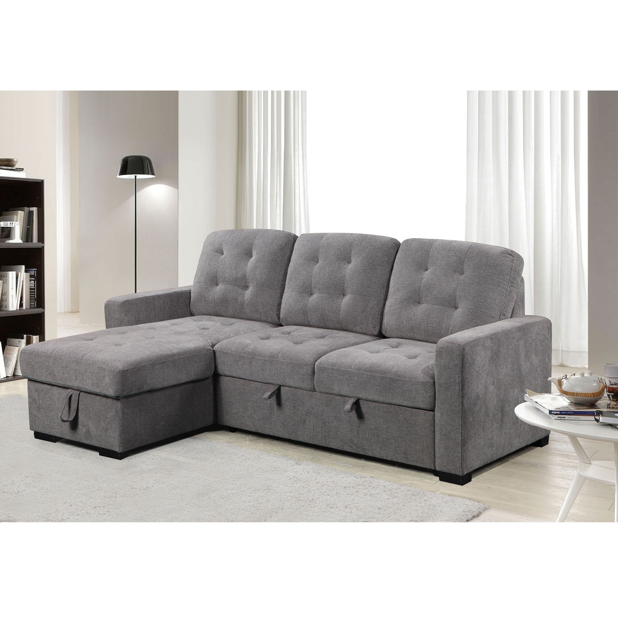This sectional couch provides comfortable seating for both family and friends, with the added bonus of a chaise for an extra level of relaxation. The pullout sleeper transforms this sofa into a perfect solution for those unexpected overnight guests. The neutral grey color effortlessly complements any decor, ensuring a timeless choice for your home.