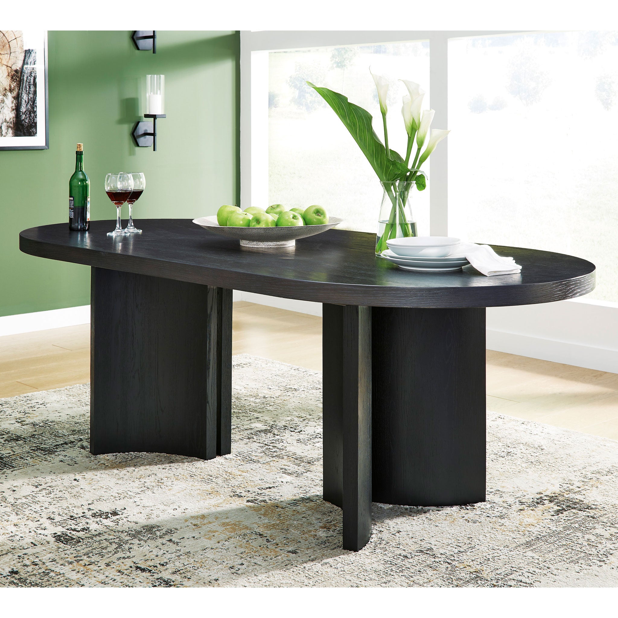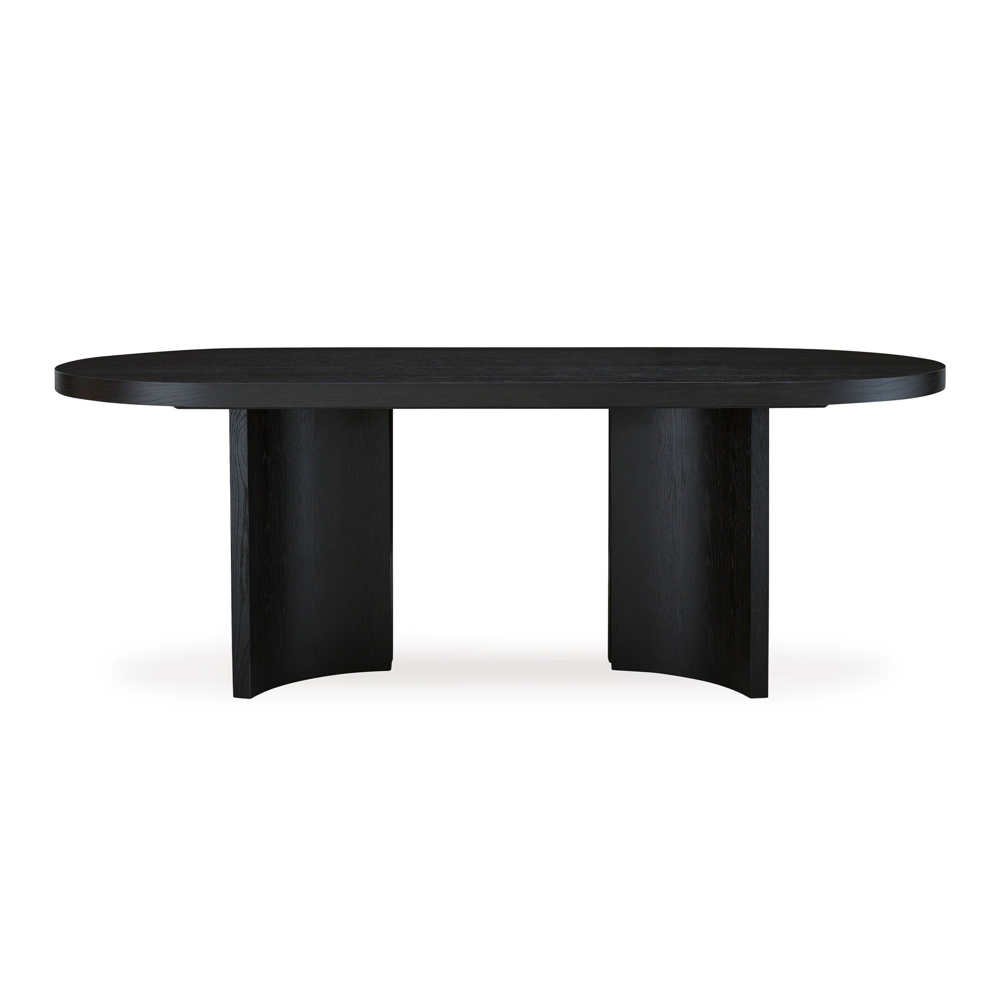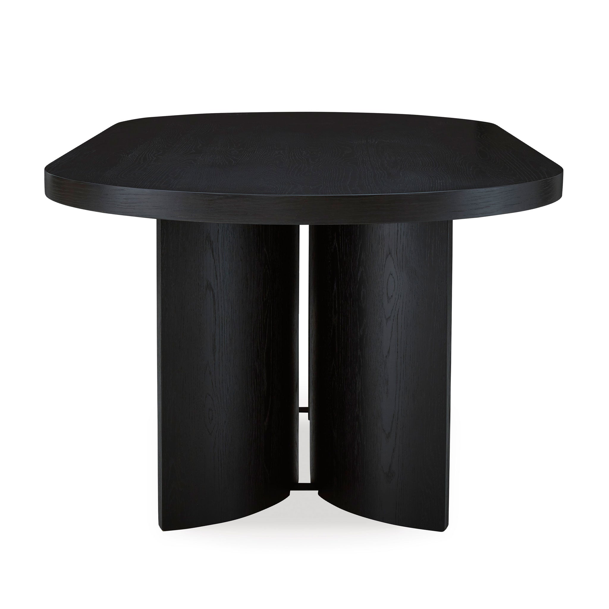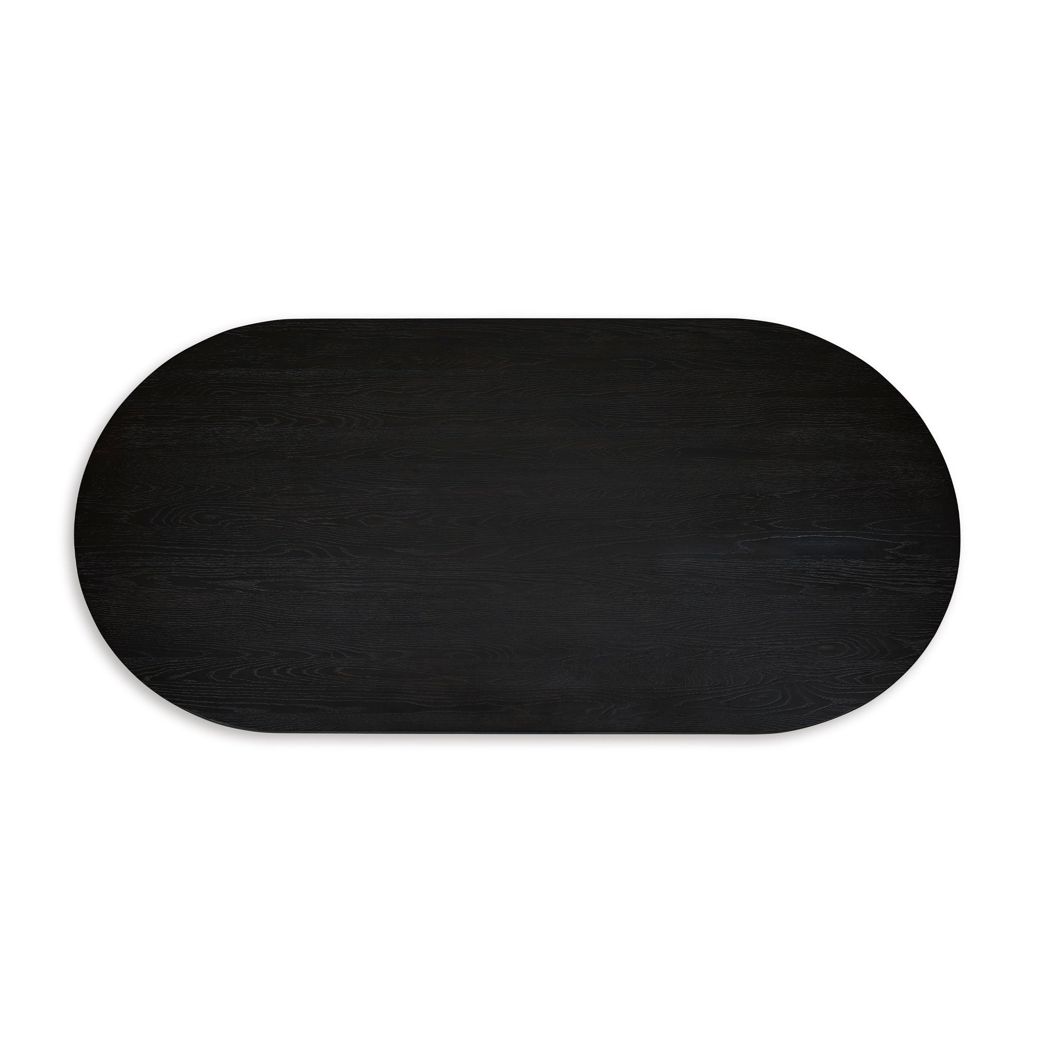 Informed by art deco design, this oval dining table makes a lasting impression in a simply stunning way. Its magnificent curved silhouette and architectural pedestal are enhanced with a rich layered black finish. It’s the contemporary statement piece you’ve been seeking to elevate late-night dinners and full-on family feasts.