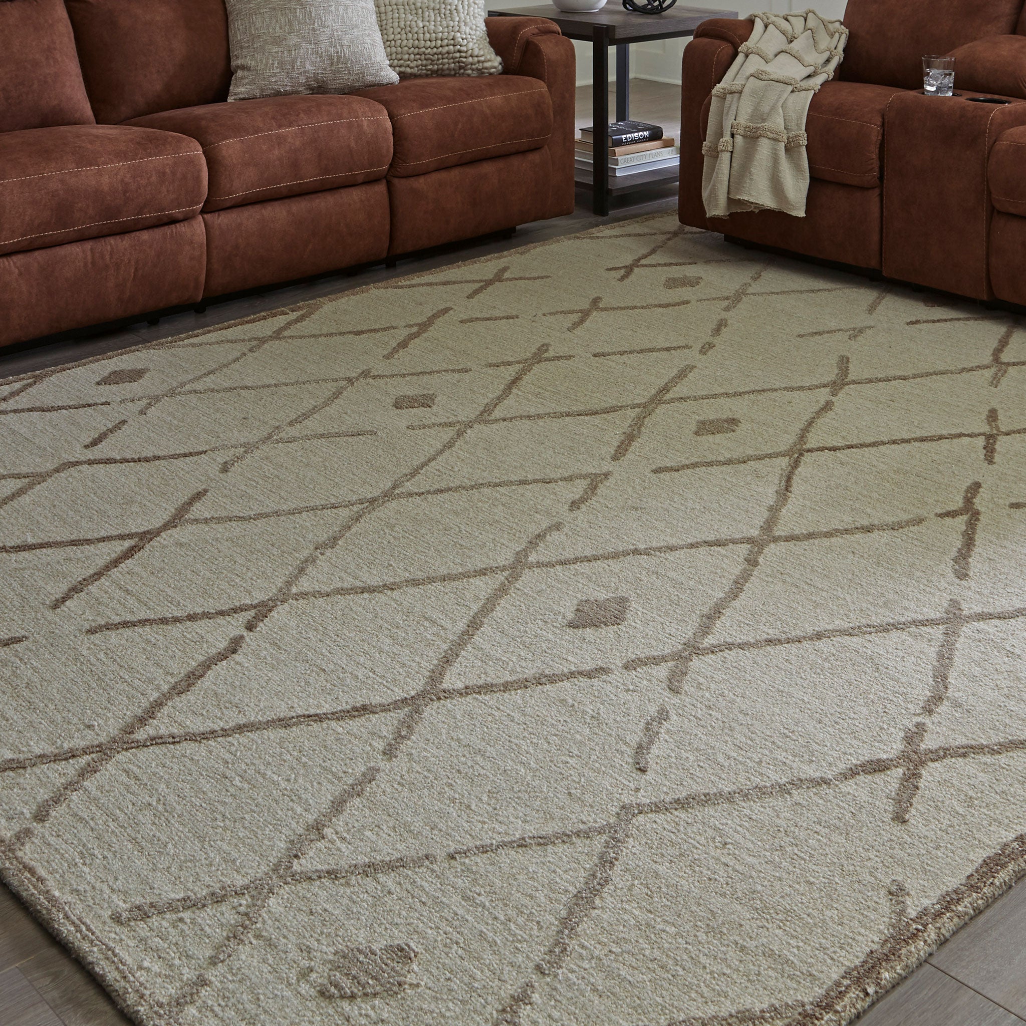 This elegant, understated area rug masterfully combines design and durability. Hand-tufted for superior quality, its geometric pattern and neutral palette pair seamlessly with rustic and contemporary decorative schemes. With a soft and cozy texture, this rug offers welcoming appeal with every step.