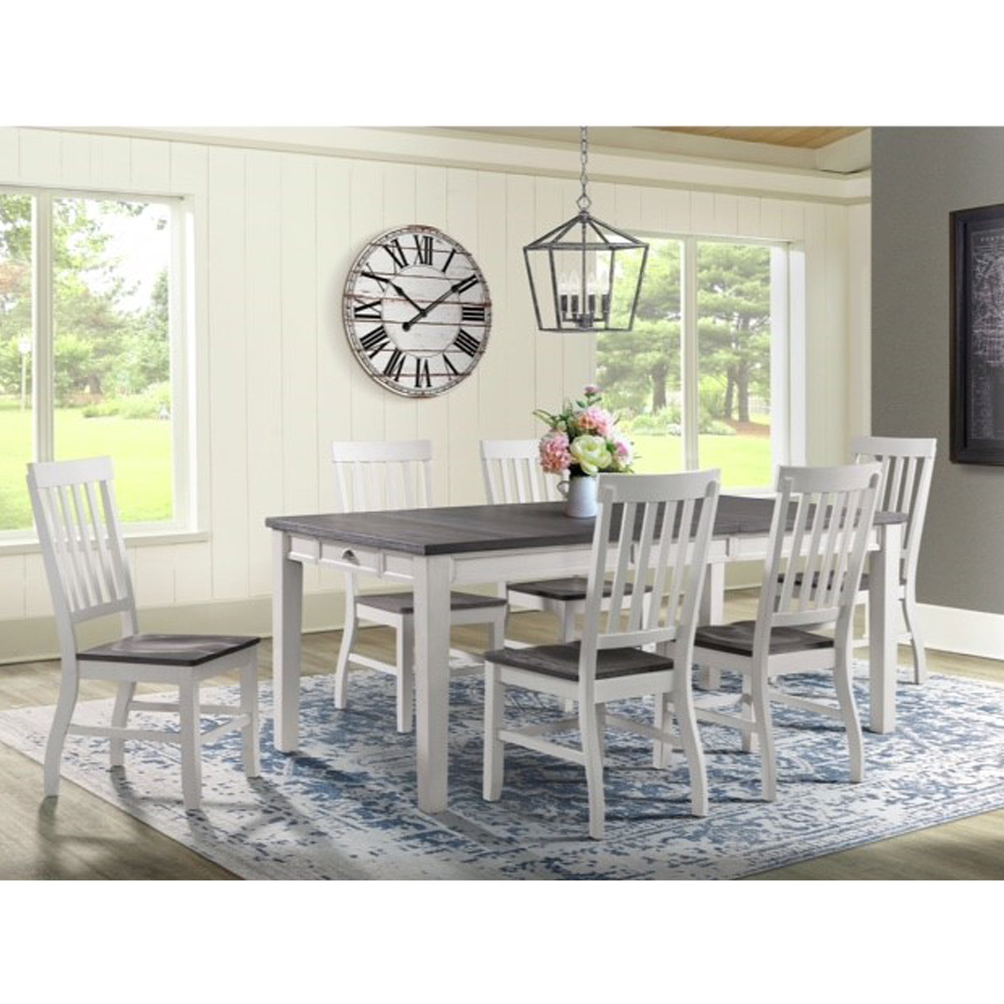 The Kayla 7 Piece Dining Set presents an elegant white with a brown top dining room table paired with six chairs, making it an impeccable addition to any modern home. Crafted with precision and style, this set showcases a sleek and contemporary design, elevating the aesthetic of your dining space. The table's sophisticated brown and white finish exudes refinement, while the six matching chairs offer comfort and support for delightful meals and gatherings.