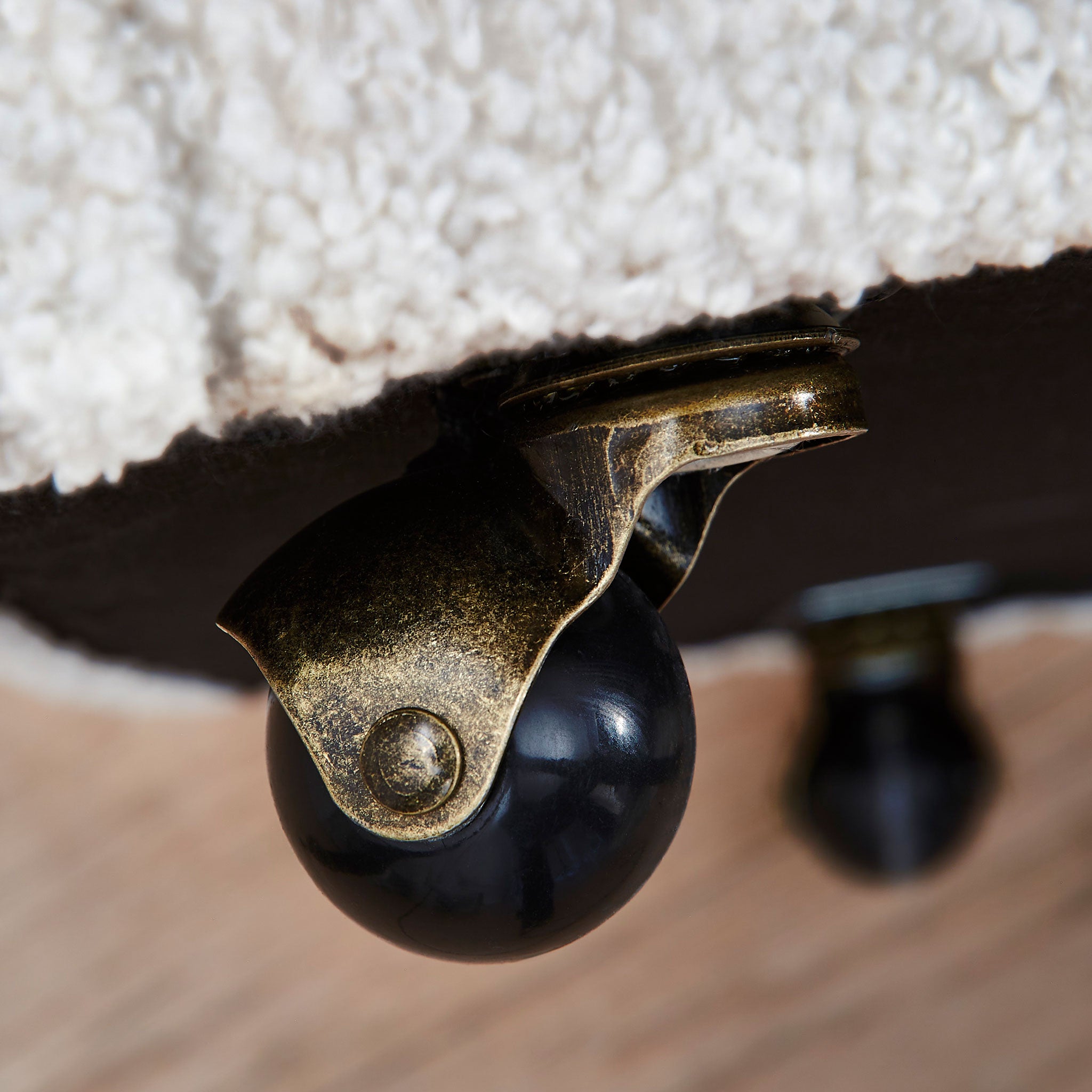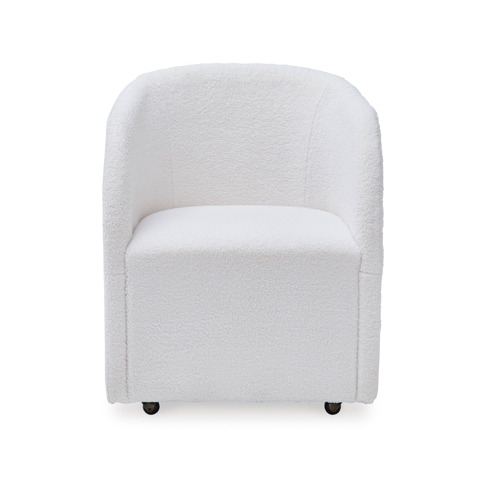 The set includes four sleek, curved-back chairs with herringbone-patterned cushions, adding comfort and flair. For added versatility, two fully upholstered chairs in neutral boucle fabric feature casters for easy mobility, making them perfect for flexible seating arrangements.