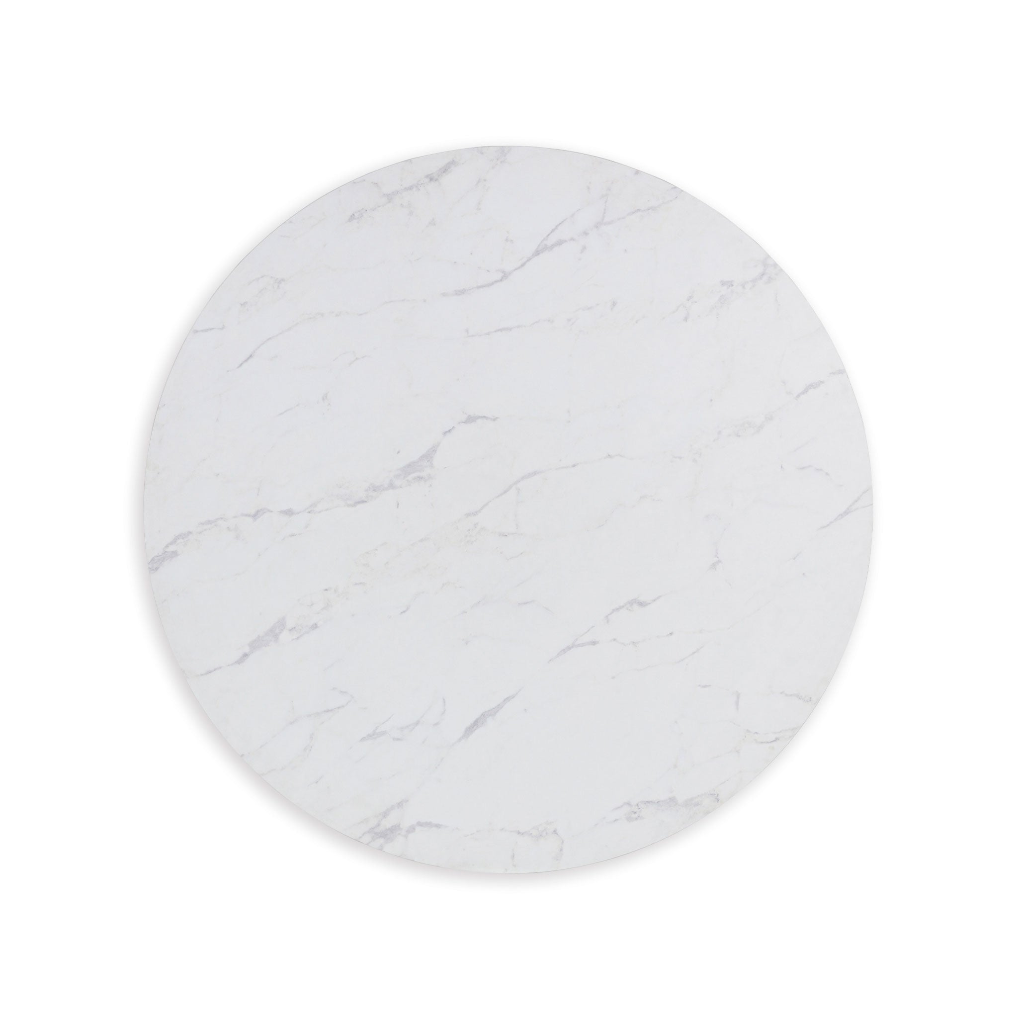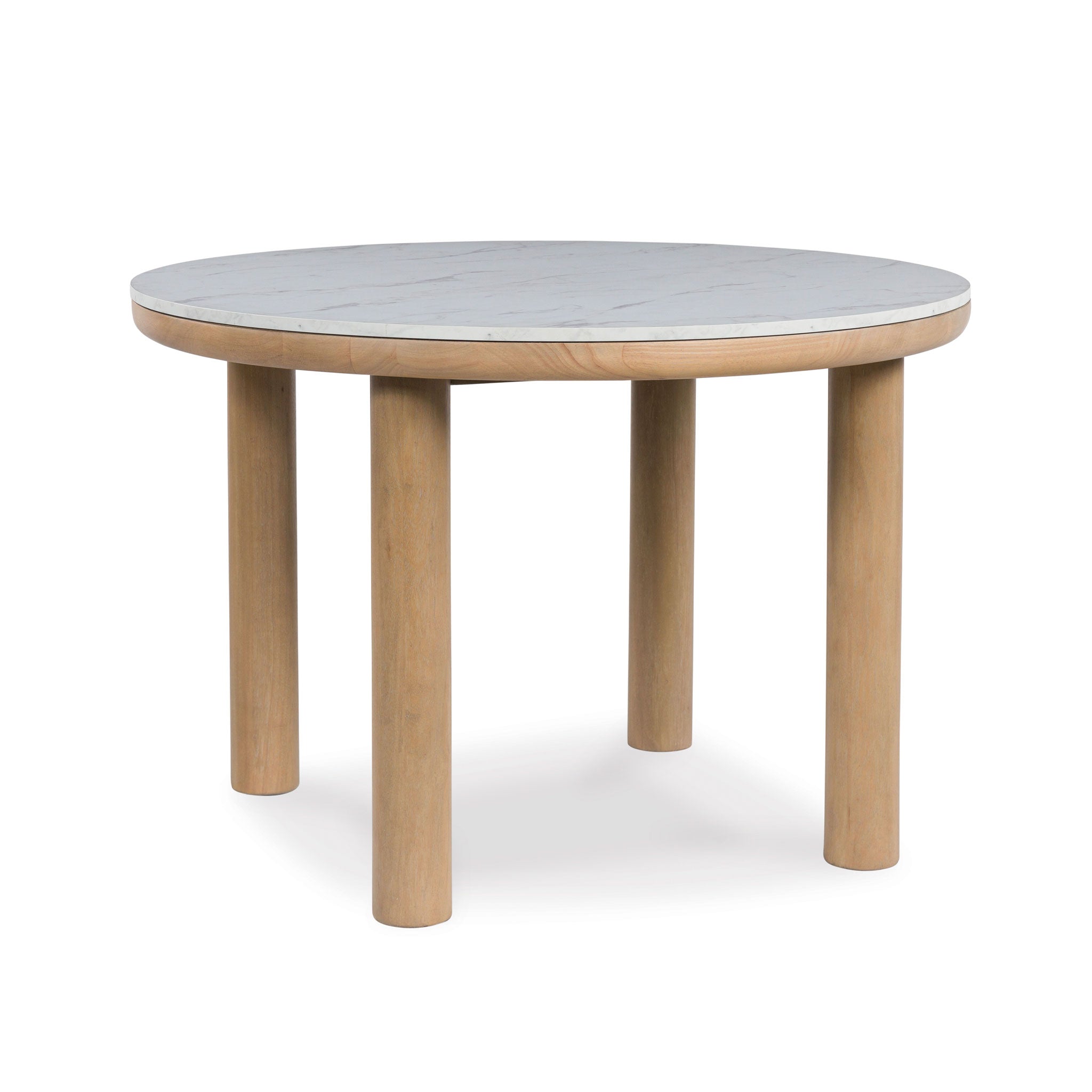 Clean lines meet cool curves with this dining table. Chunky round post legs and a natural finish lend a modern vibe, while a replicated white marble top completes the casual lifestyle design. What a delicious choice for a dining room update.